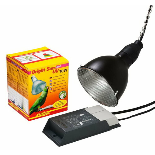 • УФ лампа Bright Sun UV Bird 70 ватт с цоколем E27 (артикул BSB-70),• пускорегулирующее устройство Lucky Reptile Bright Control EVO 70 Вт (артикул BCV-70),• светильник с патролном, отражателем и защитной сеткой (Thermo Socket plus Reflector) (артикул HTRP-1),• цепочка для подвешивания светильника к потолку клетки или на держатель.