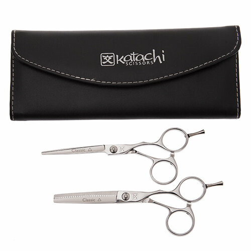Комплект парикмахерских ножниц в удобном чехле из кожезаменителя с фирменным логотипом Katachi. В набор входят ножницы для стрижки Offset 5.5" и филировочные ножницы Offset 5.5" эргономичной формы (30 зубцов). Чехол удобен для хранения и транспортировки Ваших ножниц. В комплект входит специальный ключ для регулировки натяжения полотен ножниц.