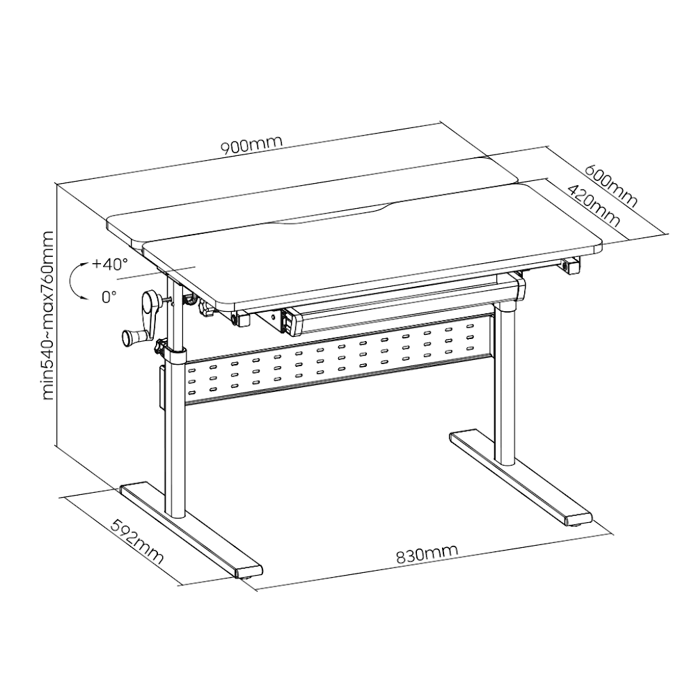 Парта и кресло изготовлены из качественной углеродистой стали (Q235), АБС, ПП, ДСП класса E0 и ПВХ. Размеры парты составляют 900x600x540~760mm, а размер рабочего стола - 900x600mm. Диапазон наклона рабочего стола варьируется от 0 до 40 градусов, а механизм наклона оснащен поворотной ручкой. Диапазон высоты стола составляет 540~760mm.