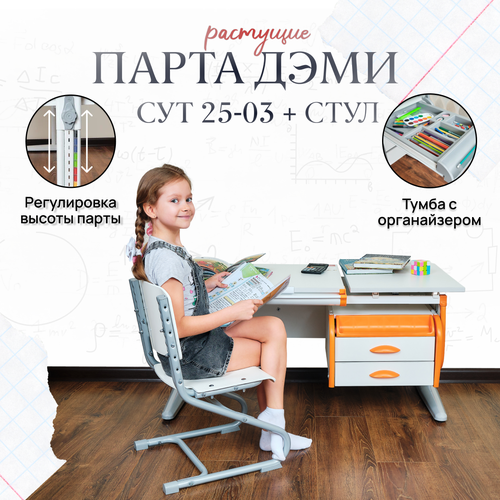 Комплект парта растущая ДЭМИ СУТ-25-03 с тумбой, со стулом, размер 120х55х81,5 см цвет ЛДСП белая, накладки оранжевые, ноги серые: сравнение цен, характеристики, фото, актуальное наличие и цены.