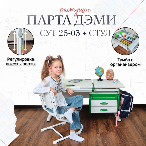Комплект парта растущая ДЭМИ СУТ-25-03 с тумбой, со стулом, размер 120х55х81,5 см цвет ЛДСП белая, накладки зеленые, ноги белые