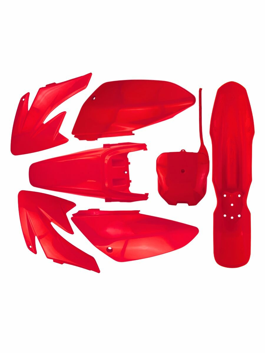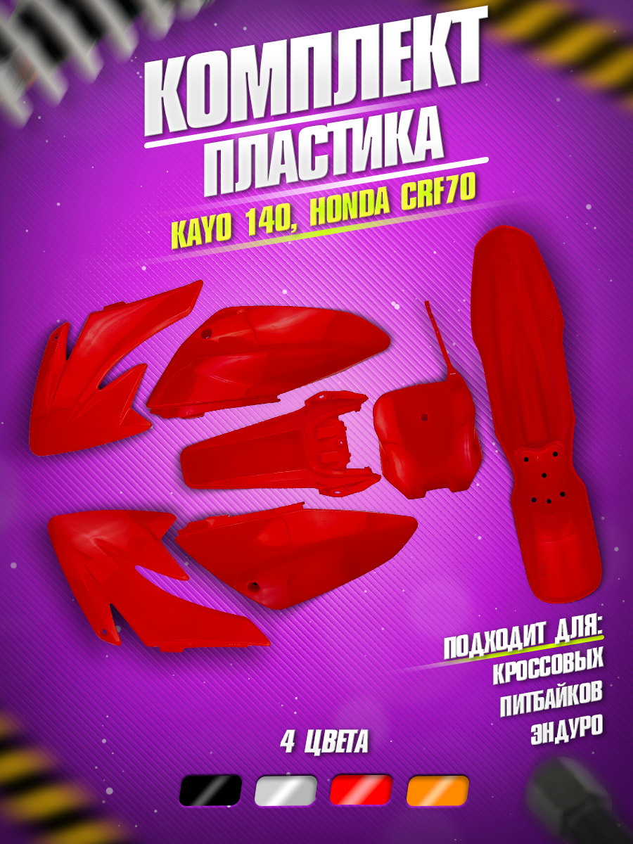 Красный комплект пластика для питбайков, эндуро и кроссовых мотоциклов – это высококачественный набор деталей, предназначенный для полной или частичной замены внешнего обвеса мотоциклов таких моделей, как Ирбис, Honda, Kayo, Regulmoto, Motoland и других. Комплект пластика на эндуро включает в себя переднее и заднее крылья, номерной щиток, боковые обтекатели и облицовки бака, которые не только обновляют внешний вид мотоцикла, но и обеспечивают надежную защиту его внутренних механизмов.