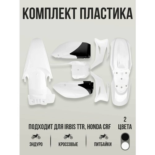 Комплект пластика белый для эндуро и кроссовых мотоциклов, питбайков ирбис ттр 125, ирбис ттр110, хонда црф70 представляет собой тщательно разработанный набор деталей, предназначенных для полной или частичной замены внешнего обвеса вашего мотоцикла.