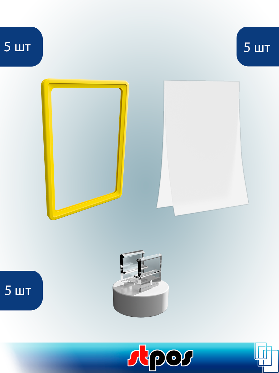 Купить Комплект Пластиковая рамка А5, Желтый+ Карман-протектор A5, Прозрачный + Магнитный держатель MGT-RND-90, Серый по 5 шт с доставкой по всей России.