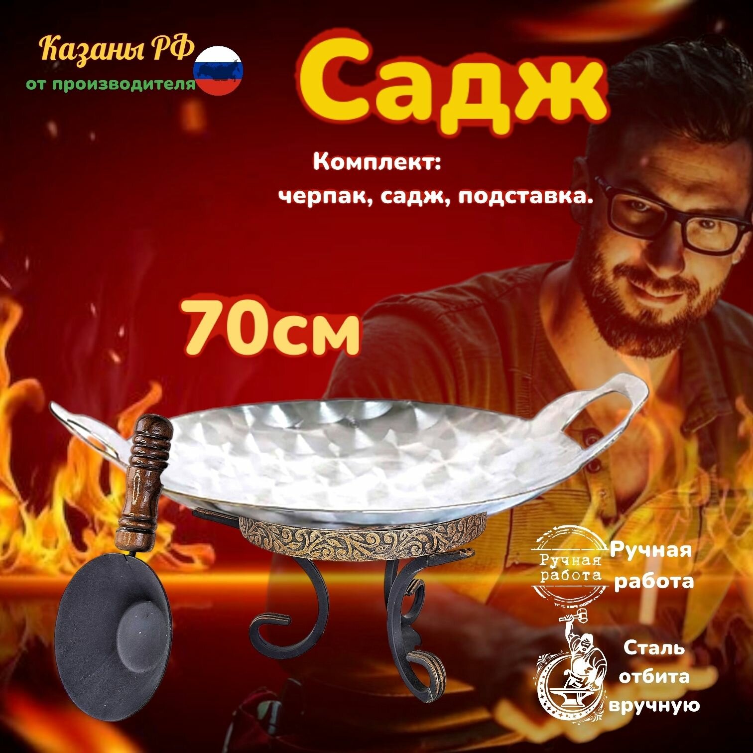 Купить Комплект Подставка с черпаком+Садж из нержавеющей стали плоский 70см. КазаныРФ с доставкой по всей России.