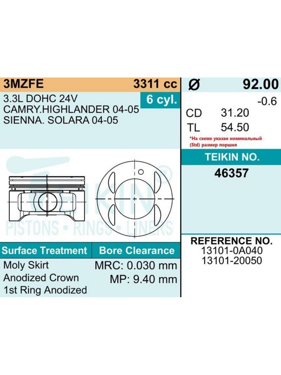 Купить Комплект поршней TOYOTA 3MZ-FE, d92.0+0.50, Teikin 46357.050 с доставкой по всей России. Комплект поршней TOYOTA 3MZ-FE, d92.0+0.50, Teikin 46357.050: сравнение цен, характеристики, фото, актуальное наличие и цены.