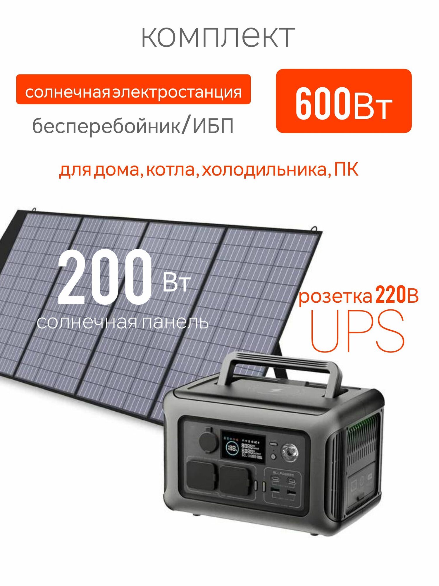 - Суммарная мощность комплекта электростанции для дома / газового котла: 800Вт (600Вт ИБП + 200Вт солнечная панель).