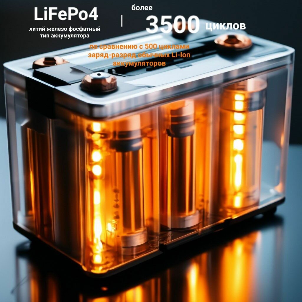 LiFePo4 (литий железо фосфатный LFP) тип батареи позволяет увеличить ресурс станции до 3500 циклов заряда (по сравнению с 500 у традиционных Li-Ion)