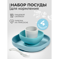 - набор из широкой силиконовой тарелки объемом 600 мл, глубокой силиконовой тарелки объемом 300 мл, силиконового стакана объемом 150 мл и силиконовой эргономичной ложки