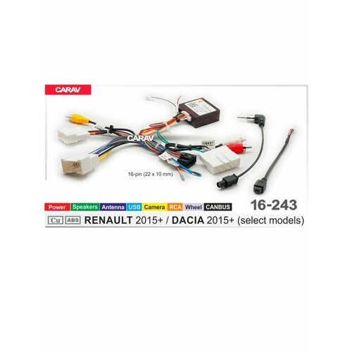CARAV 16-243_RENAULT - Комплект проводов (дополнительное монтажное оборудование) для подключения 9 и 10.1 дюймовых автомагнитол на автомобили: RENAULT 2015+ (select models) / Питание + Динамики + Antenna + Wheel + Camera + USB + RCA + CANBUS Рекомендуется для профессиональной и любительской установки (инсталляции) автомобильного аудио-видео оборудования. В производстве данной модели использованы материалы высшего качества.