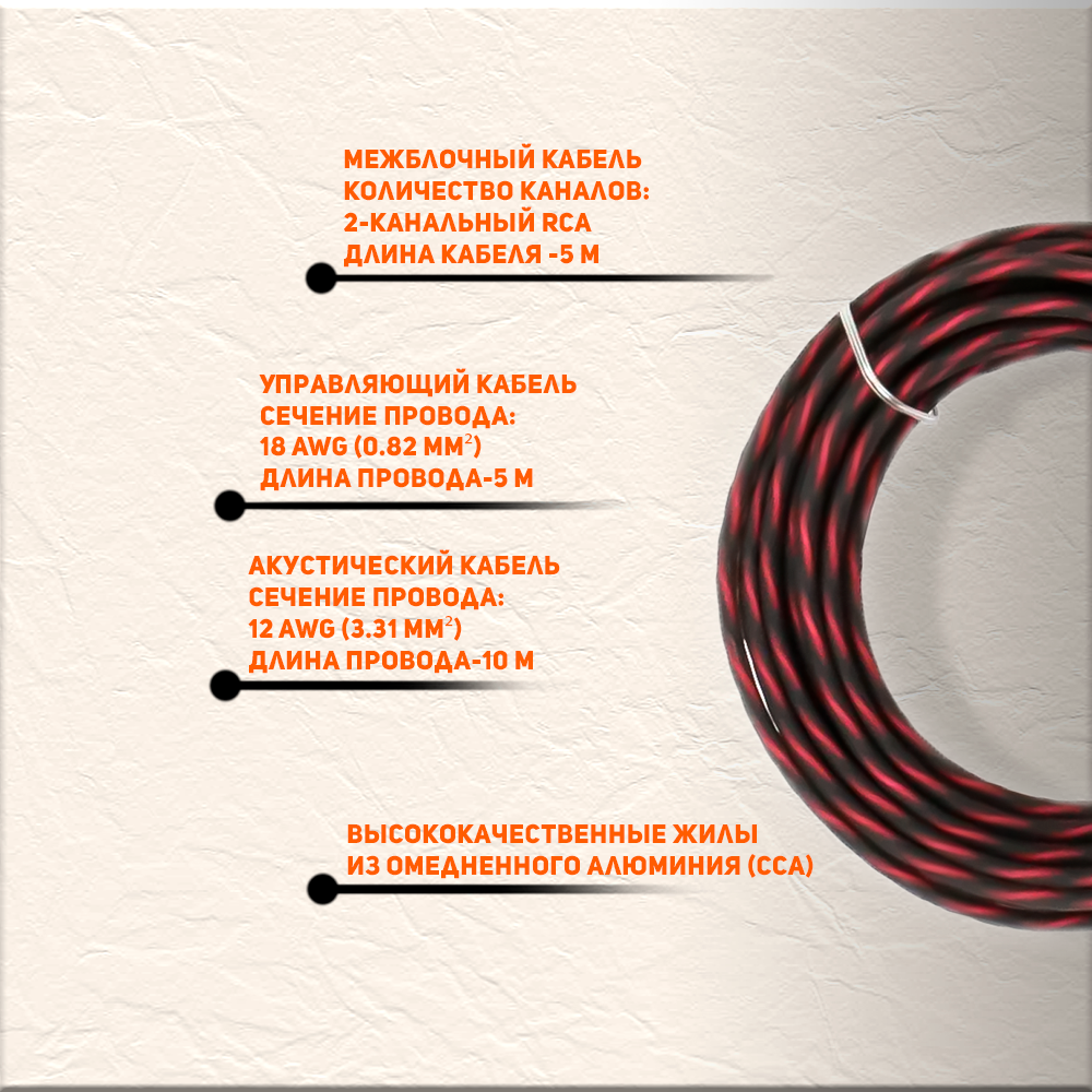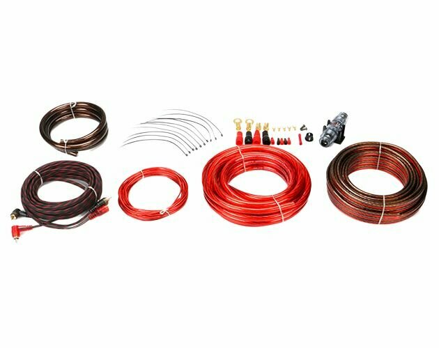 • Силовые кабели: • Красный: 5 м, 4 GA • Черный: 1 м, 4 GA • Акустический кабель: 10 м, 12 GA • Межблочный кабель: 5 м, RC • Держатель с предохранителем: 80А • Управляющий кабель: 5 м, 18 G • Клеммы: различные (4 GA и 12 GA) • Дополнительные аксессуары: защитная втулка, изоляционный наконечник, винты, хомуты