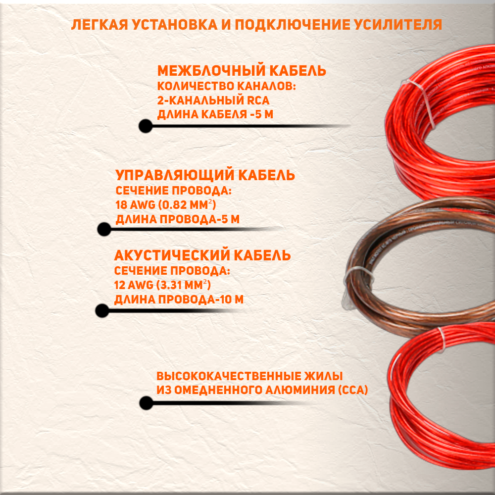 • Силовой кабель КС-МТ4 КРАСНЫЙ: 5 метров, сечением 4 GA (23,31 мм²) • Силовой кабель КС-МТ4 ЧЕРНЫЙ: 1 метр, сечением 4 GA (23,31 мм²) • Акустический кабель КА-МТ12: 10 метров, сечением 12 GA (2x3,52 мм²) • Межблочный 2RCA-2RCA кабель КМ 2RCA-МТ5М: 2 комплекта длиной 5 метров (прямые + угловые RCA-разъемы) • Держатель с компрессионными зажимами с предохранителем типа MiniANL на 80А: 1 шт. • Управляющий кабель, сечением 18 GA (0,82 мм²): 5 метров • Клемма кольцевая для силового кабеля, сечением 4 GA (23,31 мм²): 2 шт. • Клемма U-образная для силового кабеля, сечением 4 GA (23,31 мм²): 2 шт. • Клемма U-образная для акустического кабеля, сечением 12 GA (2x3,52 мм²): 5 шт. • Защитная резиновая втулка для протяжки силового кабеля в салон автомобиля: 1 шт. • Изоляционный наконечник для управляющего кабеля: 1 шт. • Винты черные: 2 шт. • Хомут зажимной: 10 шт.