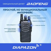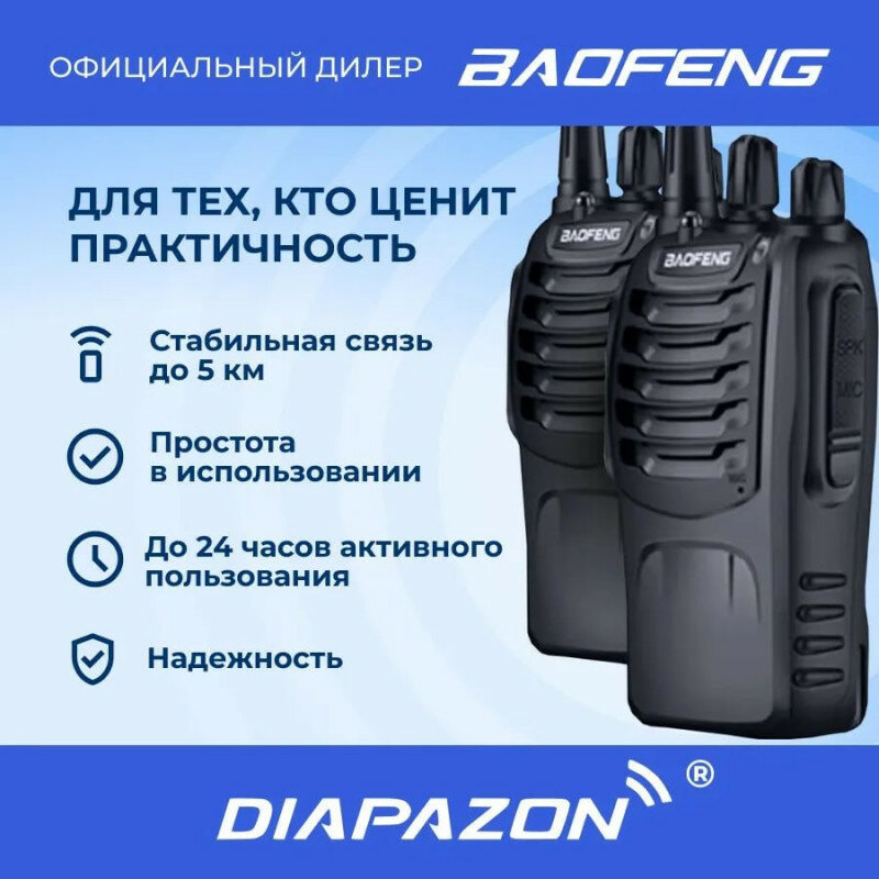 CTCSS, DCS, FM-радиоприемник, аккумуляторы, выбор уровня шумоподавления, гарнитура, голосовая активация через гарнитуру (VOX), зарядное устройство, звук при нажатии кнопок, клипса, переключение мощности передатчика, подключение гарнитуры, программирование с компьютера, регулировка громкости, ремешок, сигнал окончания передачи (Roger Beep), сканирование каналов, таймер разговора, функция "нажми и говори" (PTT), шумоподавление