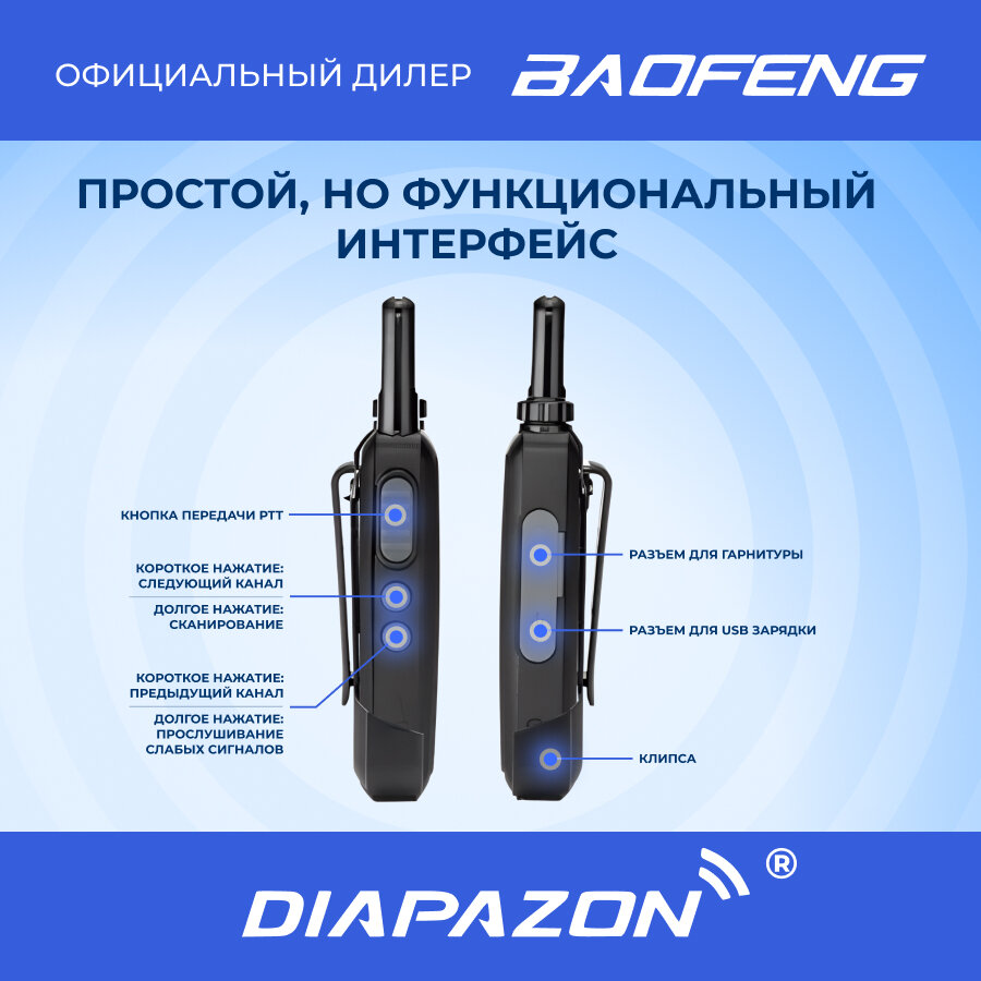 CTCSS, DCS, FM-радиоприемник, аккумуляторы, выбор уровня шумоподавления, гарнитура, голосовая активация через гарнитуру (VOX), зарядное устройство, звук при нажатии кнопок, клипса, переключение мощности передатчика, подключение гарнитуры, программирование с компьютера, регулировка громкости, ремешок, сигнал окончания передачи (Roger Beep), сканирование каналов, таймер разговора, функция "нажми и говори" (PTT), шумоподавление