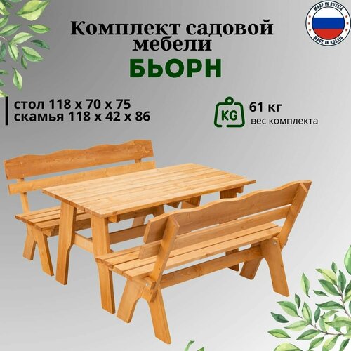 Комплект садовой мебели "Бьорн 120" от фотон - это стильный и функциональный набор садовой мебели, который станет отличным дополнением к вашему саду или дому. Изготовленный из массива дерева, этот комплект гарантирует прочность и долговечность, а нанесенная на мебель защитная пропитка обеспечивает дополнительную защиту.