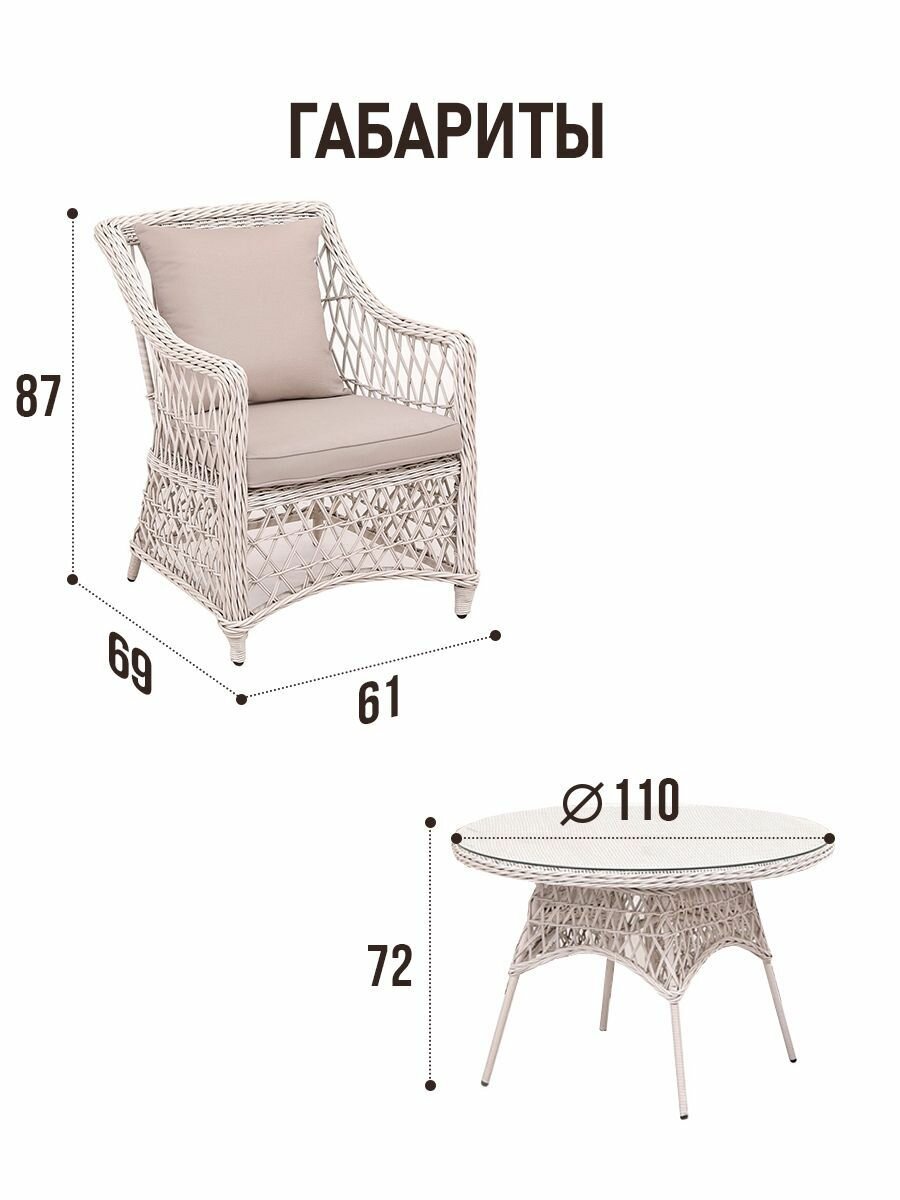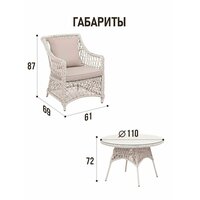 Изготовленная из качественного искусственного ротанга, мебель обладает высокой устойчивостью к внешним воздействиям, включая ультрафиолетовые лучи и осадки. Поэтому вы сможете наслаждаться ею на протяжении всего сезона. Набор включает удобные кресла и стол, что делает его универсальным для различных мероприятий: от простых чаепитий до больших встреч с друзьями и семьей.