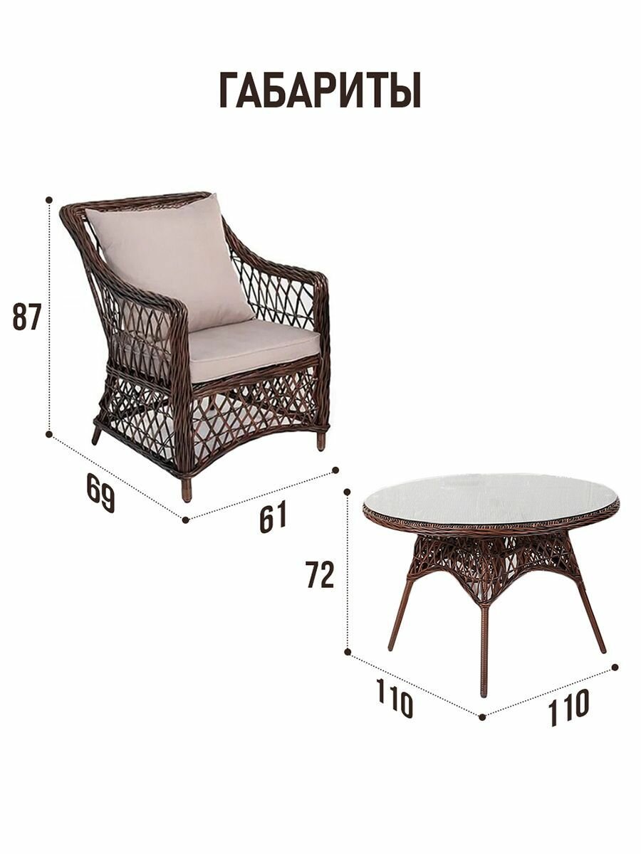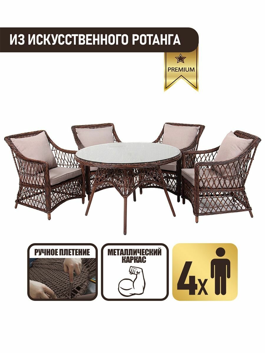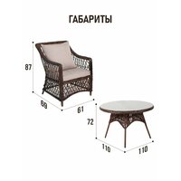 Садовая мебель из искусственного ротанга устойчива к солнечным лучам и не выгорает, что делает ее идеальной для использования в условиях яркого солнца. Этот комплект подходит как для ежедневного использования, так и для особых случаев, добавляя роскоши и уюта в вашу жизнь.