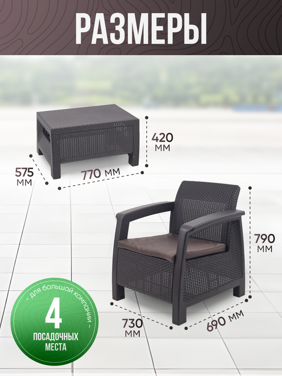 Комплект садовой мебели "Holiday L" (коричневый) - это стильный и функциональный набор мебели, который станет отличным дополнением к вашему саду или террасе. Комплект включает в себя два кресла и стол, что позволяет комфортно разместиться двум персонам. Мебель выполнена в коричневом цвете, который гармонично сочетается с различными природными оттенками и создает уютную атмосферу. Мебель изготовлена из высококачественного пластика, который обеспечивает долговечность и устойчивость к воздействию погодных условий. В комплект входит пять предметов: два кресла, стол и два стула. Это позволяет вам выбрать наиболее подходящий вариант для вашего сада или террасы. Выбирая комплект садовой мебели "Holiday L", вы получаете стильный, функциональный и надежный набор мебели, который станет прекрасным дополнением к вашему саду или террасе.