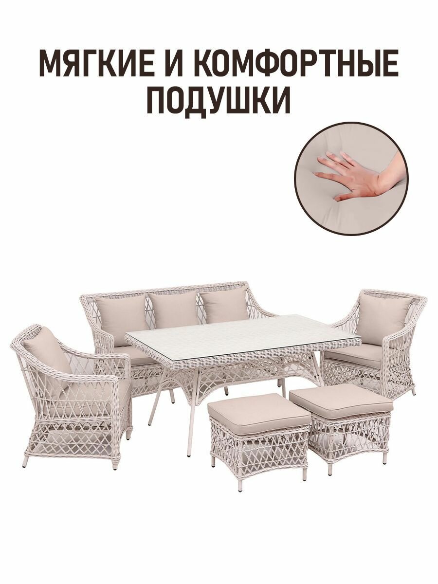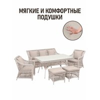 Комплект садовой мебели из искусственного ротанга Пикник-7 светло-серый станет идеальным выбором для вашего дачного участка или сада. Этот стильный и функциональный набор создаст комфортную атмосферу для отдыха на свежем воздухе. Изготовленный из качественного искусственного ротанга, комплект отличается прочностью и стойкостью к неблагоприятным погодным условиям, что делает его идеальным решением для открытых пространств.
