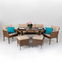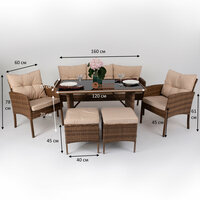 Набор мебели из искусственного ротанга, для сада, дома, дачи. Прочная стальная рама с всепогодным плетением из искусственного ротанга. Удобная уличная мебель с моющимися мягкими элементами. Отлично подойдет для использования на открытом воздухе, во внутреннем дворике, на заднем дворе, крыльце, в саду, у бассейна, на балконе. Набор включает: 1 трехместный диван с подушками, 2 одноместных кресла с подушками, 2 одноместных пуфа с подушками и 1 стол с закаленным стеклом. Размеры дивана (ДхШхВ): 1610х670х780мм, размеры кресла: 600х670х780 мм, стол: 1200х640х700мм, пуф: 380х380х400мм. Цвет каркаса: коричневый, цвет мягкого элемента: бежевый.