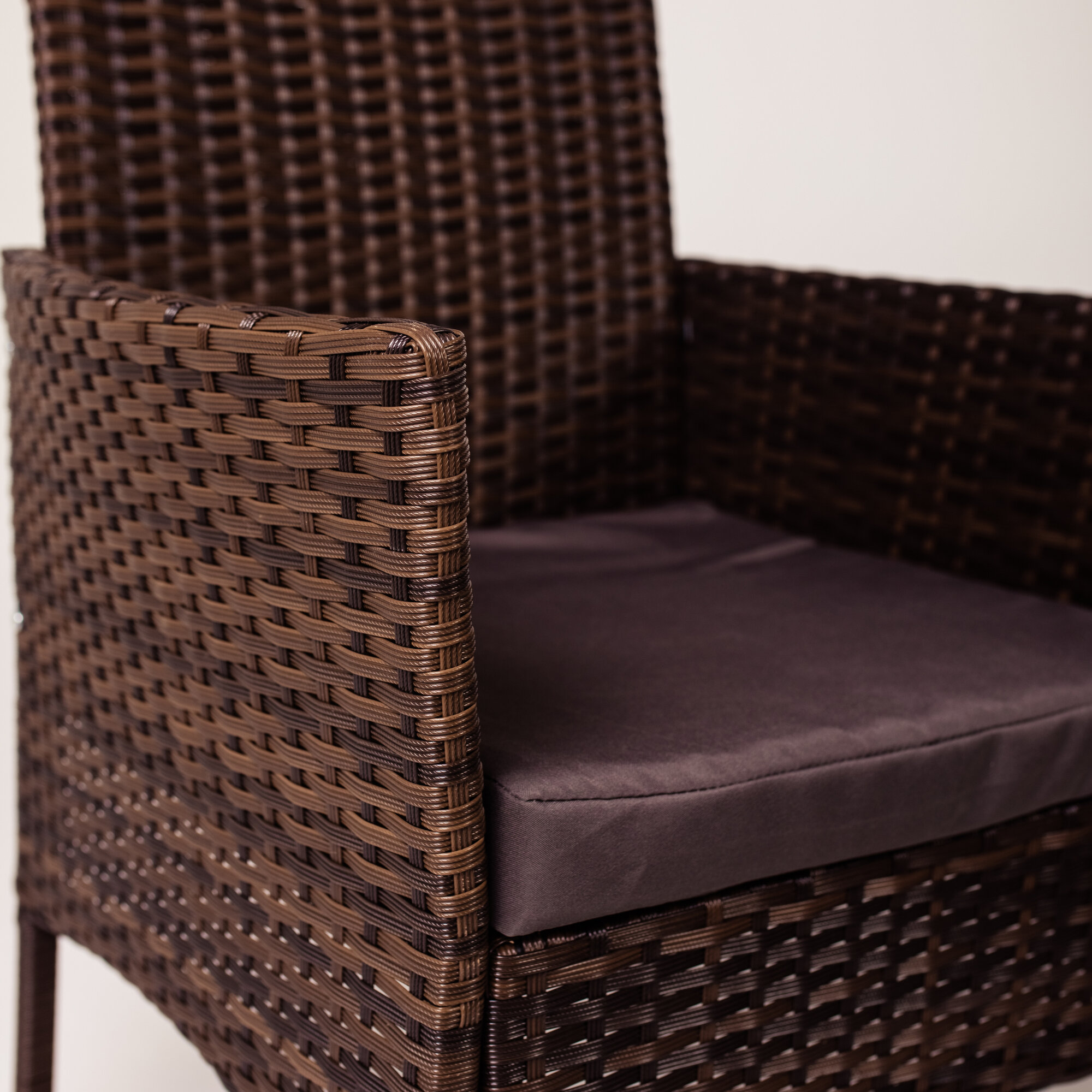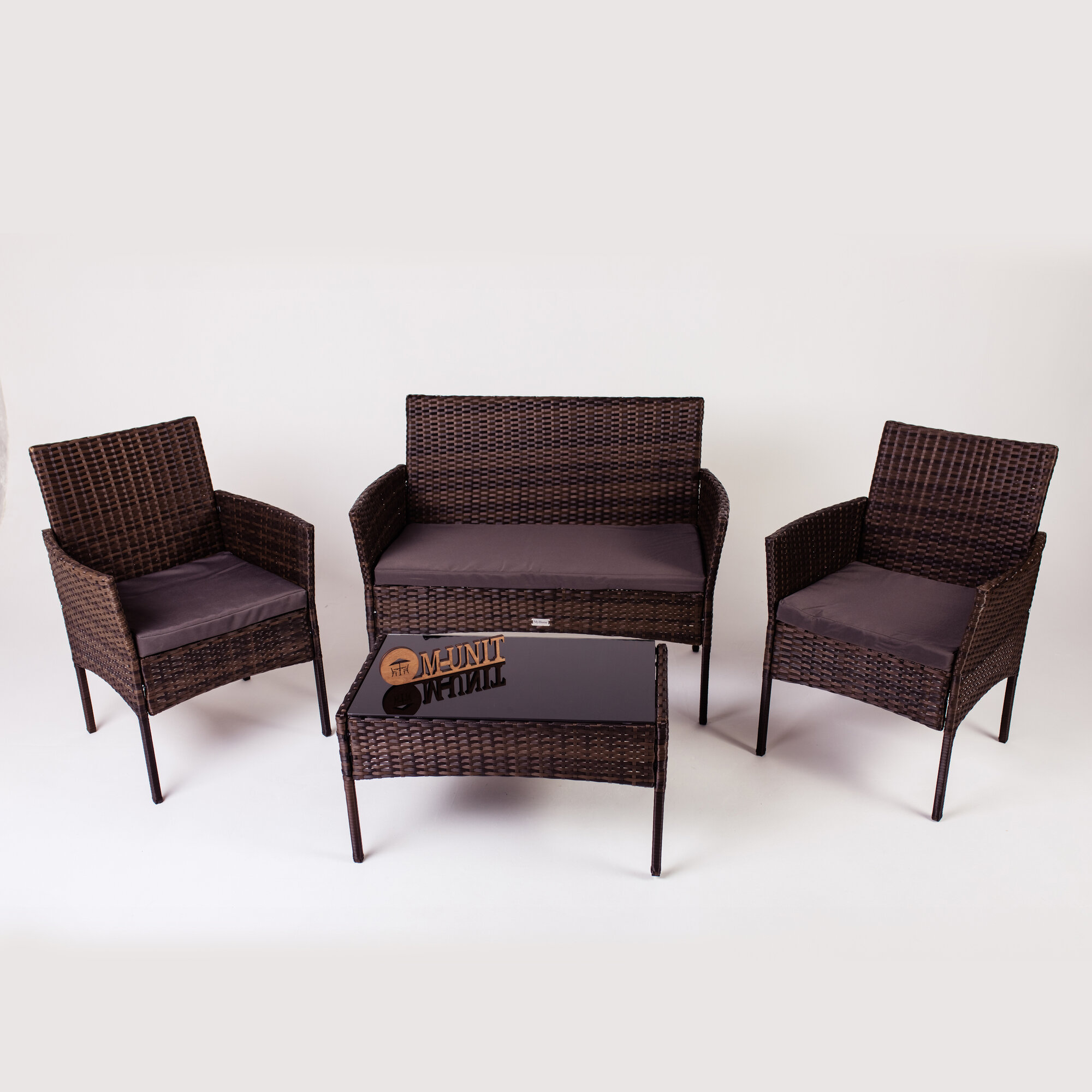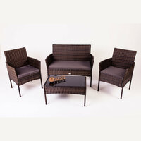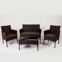 Набор мебели, для сада, дома, дачи. Прочная стальная рама с всепогодным плетением из искусственного ротанга. Удобная уличная мебель с моющимися мягкими элементами. Садовый набор отлично подойдет для использования на открытом воздухе, во внутреннем дворике, на заднем дворе, крыльце, в саду, у бассейна, на балконе. Комплект включает 1 двухместный диван с подушкой, 2 одноместных кресла с подушками и 1 стол с закаленным стеклом. Размеры дивана: (ДхШхВ) 1120х600х810 мм, кресло: 630х600х810 мм, стол: 710х400х490 мм. Цвет каркаса: темно-коричневый, цвет мягкого элемента: темно-серый.