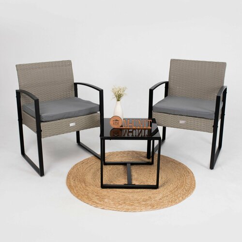 Набор мебели, для сада, дома, дачи. Прочная стальная рама с всепогодным плетением из искусственного ротанга. Удобная уличная мебель с моющимися мягкими элементами. Отлично подойдет для использования на открытом воздухе, во внутреннем дворике, на заднем дворе, крыльце, в саду, у бассейна, на балконе. Набор включает, 2 одноместных кресла с подушками и 1 кофейный столик с закаленным стеклом. Размеры кресла: (ДхШхВ) 580х550х760 мм, стол: 420х406х400мм. Цвет каркаса: серый, цвет мягкого элемента: серый.