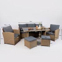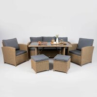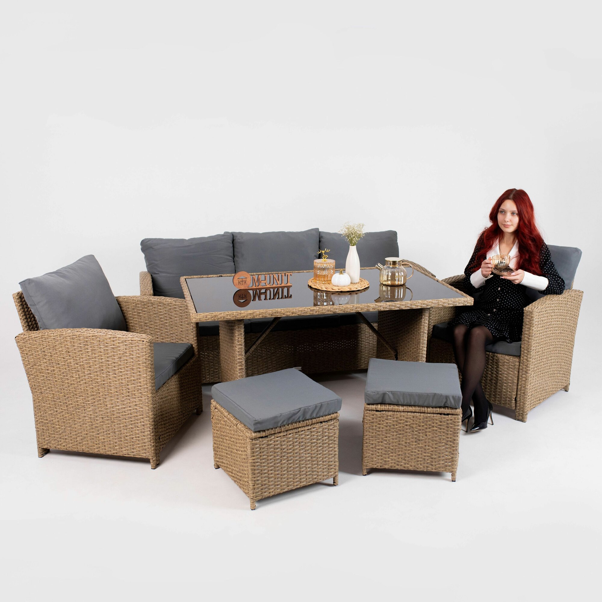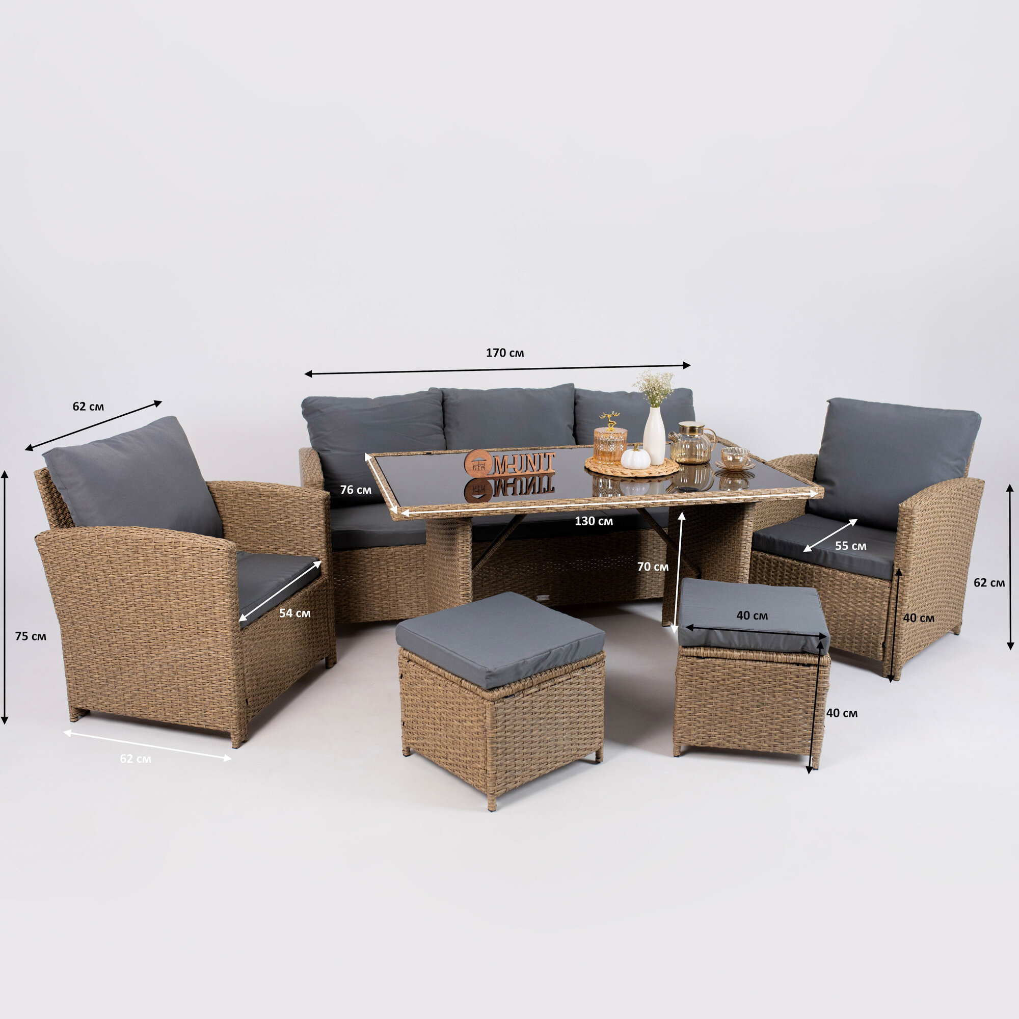 Набор мебели из искусственного ротанга, для сада, дома, дачи. Прочная стальная рама с всепогодным плетением из искусственного ротанга. Удобная уличная мебель с моющимися мягкими элементами. Отлично подойдет для использования на открытом воздухе, во внутреннем дворике, на заднем дворе, крыльце, в саду, у бассейна, на балконе. Набор включает: 1 трехместный диван с подушками, 2 одноместных кресла с подушками, 2 одноместных пуфа с подушками и 1 стол с закаленным стеклом. Размеры дивана (ДхШхВ): 170х62х75 см, размеры кресла: 54х62х75 см, стол: 130х76х70 см, пуф: 40х40х40 см. Цвет каркаса: бежевый, цвет мягкого элемента: серый.