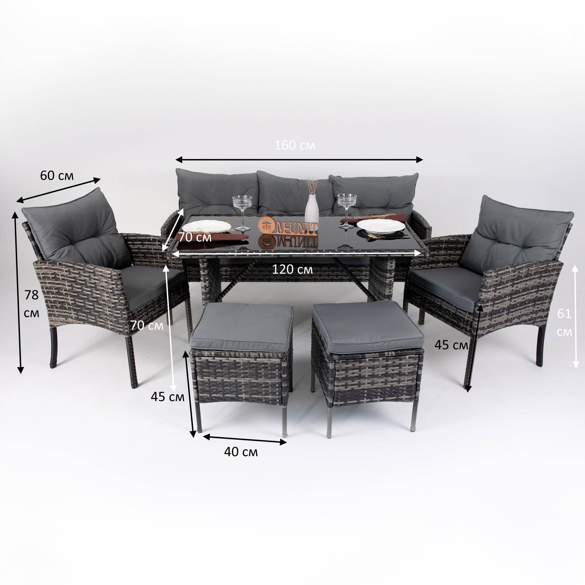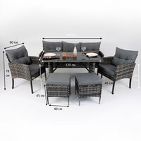 Набор мебели из искусственного ротанга, для сада, дома, дачи. Прочная стальная рама с всепогодным плетением из искусственного ротанга. Удобная уличная мебель с моющимися мягкими элементами. Отлично подойдет для использования на открытом воздухе, во внутреннем дворике, на заднем дворе, крыльце, в саду, у бассейна, на балконе. Набор включает: 1 трехместный диван с подушками, 2 одноместных кресла с подушками, 2 одноместных пуфа с подушками и 1 стол с закаленным стеклом. Размеры дивана (ДхШхВ): 160х67х78 см, размеры кресла: 60х67х78 см, стол: 120х70х70 см, пуф: 40х40х45 см. Цвет каркаса: серый, цвет мягкого элемента: серый.