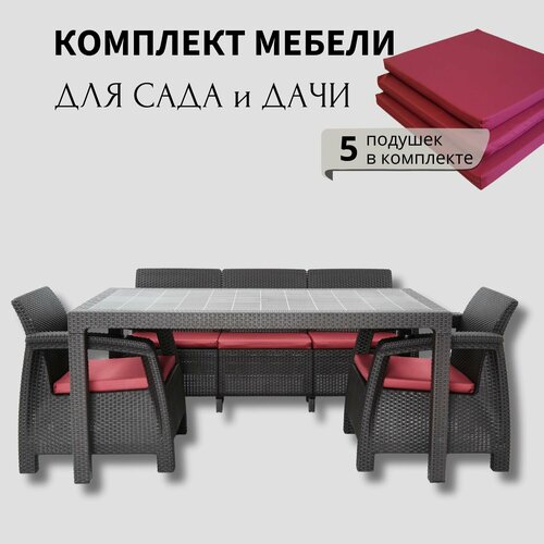 Купить Комплект садовой мебели из ротанга Set 3+1+1+обеденный стол 153х79, с комплектом бордовых подушек с доставкой по всей России. Комплект садовой мебели из ротанга Set 3+1+1+обеденный стол 153х79, с комплектом бордовых подушек: сравнение цен, характеристики, фото, актуальное наличие и цены.