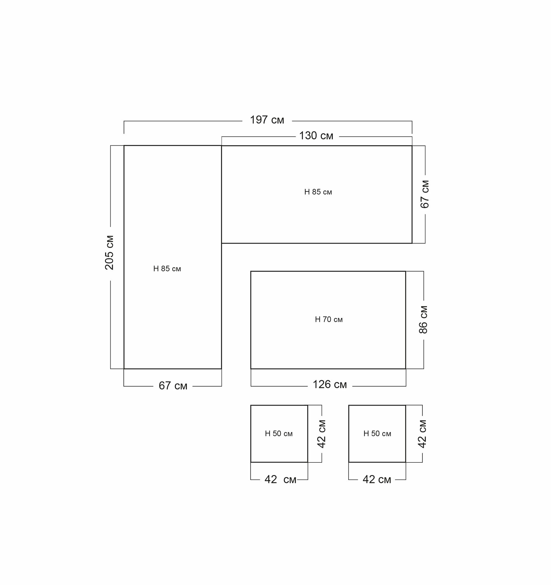 Комплект состоит из трехместного дивана 205х85х67 см, двухместного дивана - 130х85х67 см, Стола со стеклянной столешницей - 126х70х86 см и 2 пуфов - 42х50х42 см
