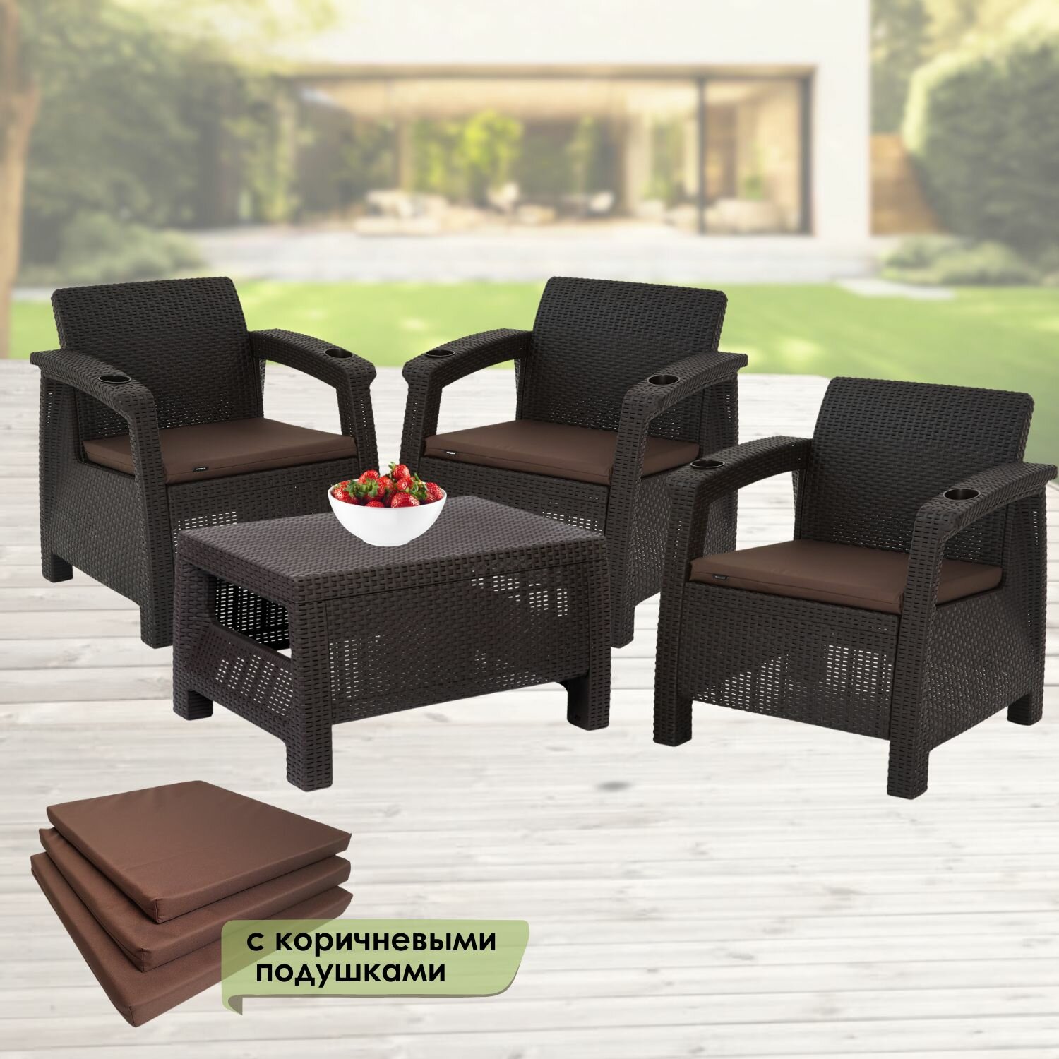 Комплект садовой мебели. Набор кофейный на 3 персоны (3 кресла + кофейный столик), искусственный ротанг, мокко, с коричневыми подушками: сравнение цен, характеристики, фото, актуальное наличие и цены.