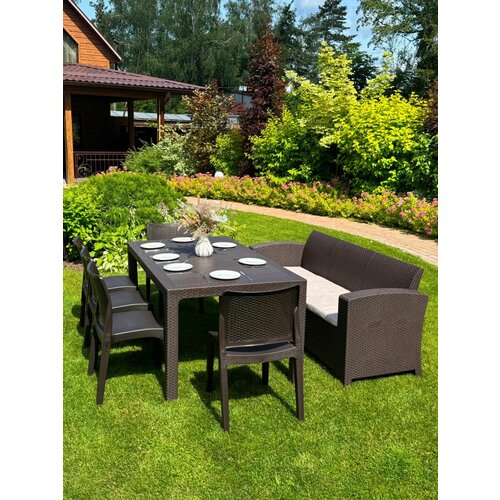 Эксклюзивные преимущества: Изготовлен из сверхпрочного полипропилена (пластиковая мебель садовая) Уникальная устойчивость к любым погодным условиям (-50°C до +50°C) Стильное сочетание коричневого (цвет поменять в зависимости от комплекта) каркаса и бежевых подушек Увеличенная вместимость - до 8 посадочных мест