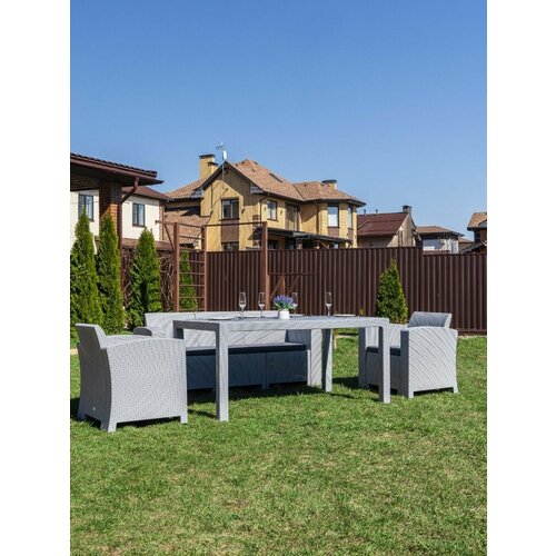 Обеденный стол JULY Габариты: 165х95х75 см. Материалы: Материал - окрашенный в массе полипропилен с повышенной прочностью Цвет комплекта - светло-серый Дополнительная информация: Поставляется в разобранном виде Температурный режим - от -50C до +50C Кресла LANA (2 шт.): Габариты: 77.5 х 64 х 76 см. Трехместный диван LANA: Габариты: 182 х 64 х 76 см. Материалы: Материал комплекта - окрашенный в массе полипропилен с повышенной прочностью Цвет комплекта - светло-серый Цвет подушек - графит Материал чехлов подушек - полиэстер Материал наполнителя подушек - поролон Дополнительная информация: Количество посадочных мест – 2 человека Максимальная нагрузка на посадочное место - 120 кг Поставляется в разобранном виде Подушка в комплекте - да Температурный режим - от -50C до +50C