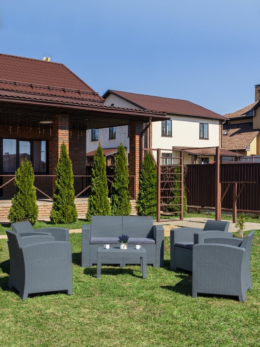 Комплектация и габариты: Двухместный диван - 129.6 х 64 х 76 см Кресло(4 шт.) -77.5 х 64 х 76 см Кофейный стол -70.5 х 50.5 х 38.5 см Материалы: Материал комплекта - окрашенный в массе полипропилен с повышенной прочностью Цвет комплекта - графит Цвет подушек - графит Материал чехлов подушек - полиэстер Материал наполнителя подушек - поролон Дополнительная информация: Количество посадочных мест – 6 человек Максимальная нагрузка на посадочное место - 120 кг Поставляется в разобранном виде Подушка в комплекте - да Температурный режим - от -50C до +50C