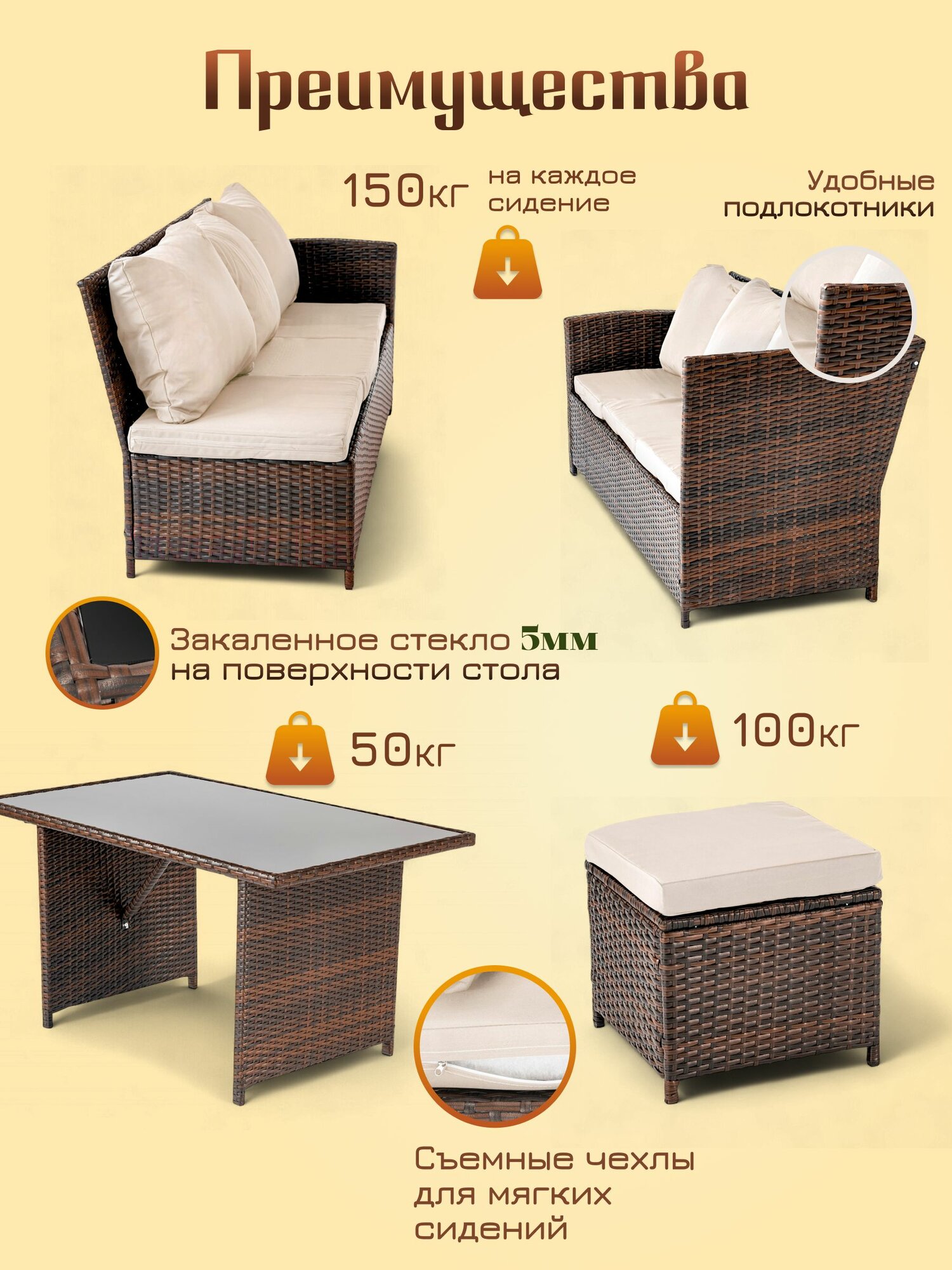 Преобразите свою дачу в уютное и приглашающее место для отдыха с нашим набором садовой мебели из ротанга. Насладитесь летними вечерами в кругу близких и создайте незабываемые моменты с нашей удобной и стильной мебелью.