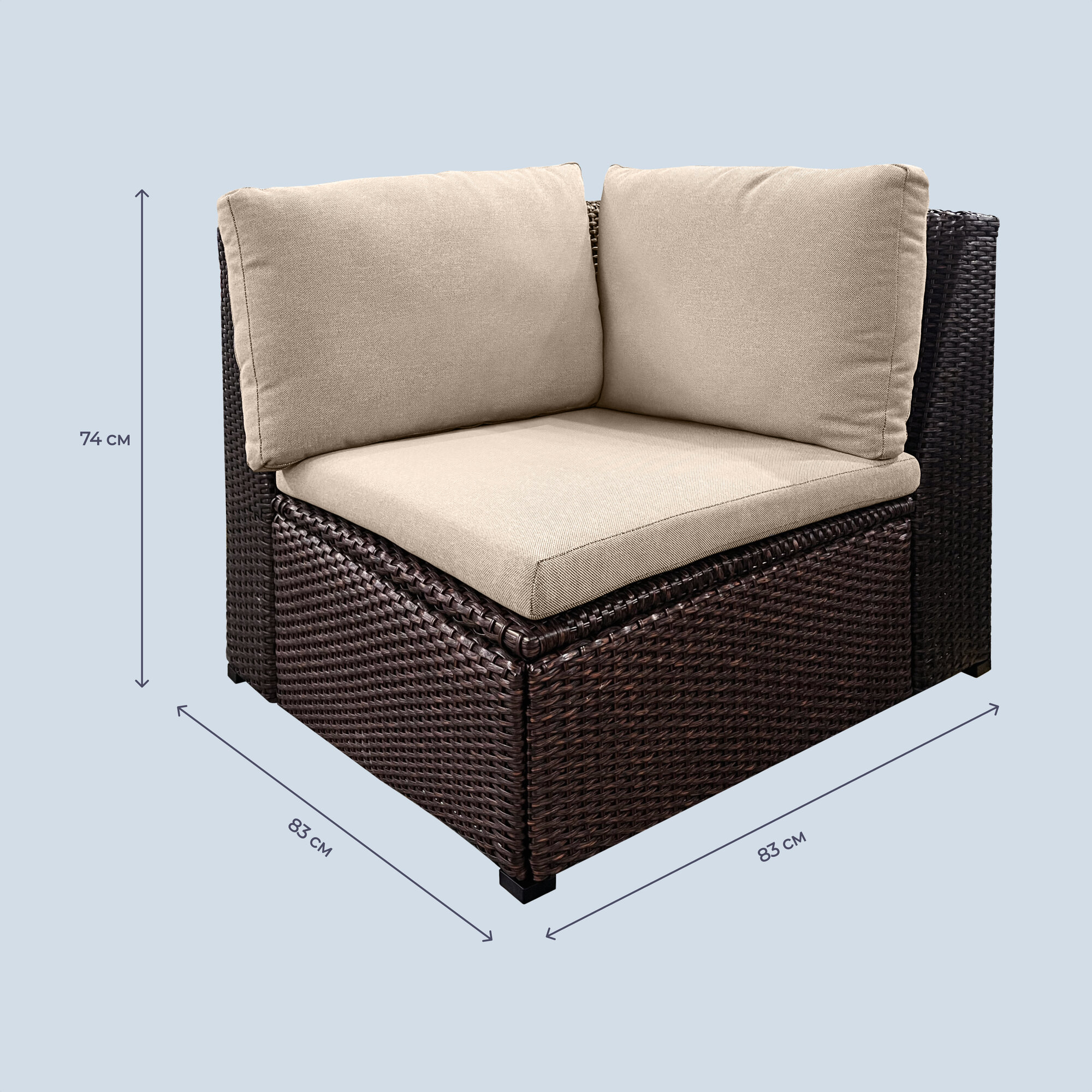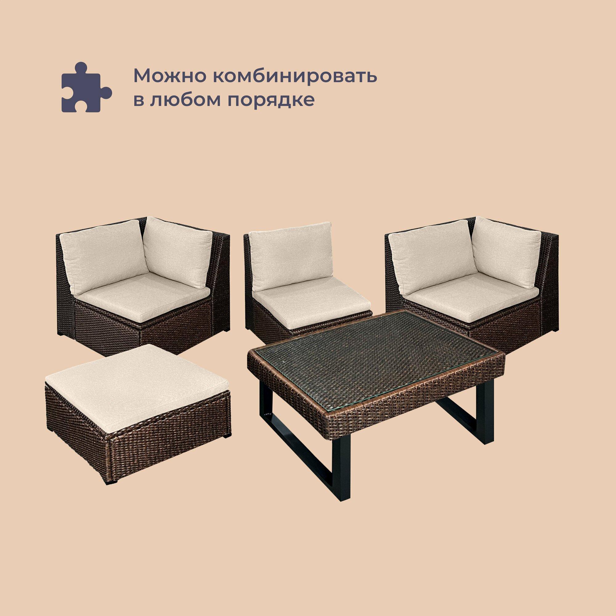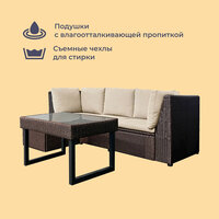 Комплект садовой мебели Homsly LFSR-500С цвета «Горький шоколад» станет прекрасным дополнением вашего сада, дачного участка или домашнего интерьера. Оплётка из искусственного ротанга устойчива к атмосферным явлениям, не промокает и не выгорает на солнце, а мягкие подушки с обивкой из полиэстера подарят комфорт и уют вам и вашим гостям. Чайный столик со столешницей из закалённого стекла добавит утончённости вашему отдыху. Благодаря стальной раме диван и кресла способны выдержать большой вес. ㅤ Комплект-трансформер позволяет создать собственную конфигурацию места для отдыха. Вы можете объединить элементы в один большой диван с пуфом или раздвинуть их для большой компании. Кресла и пуф имеют внутренние отсеки для хранения, в которые можно складывать подушки, пледы и пр. ㅤ Для вашего удобства весь комплект поставляется в единой коробке, а процесс сборки максимально прост и не требует дополнительных инструментов.
