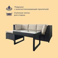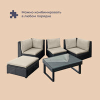 Комплект садовой мебели Homsly LFSR-500B цвета «Тёмный графит» станет прекрасным дополнением вашего сада, дачного участка или домашнего интерьера. Оплётка из искусственного ротанга устойчива к атмосферным явлениям, не промокает и не выгорает на солнце, а мягкие подушки с обивкой из полиэстера подарят комфорт и уют вам и вашим гостям. Чайный столик со столешницей из закалённого стекла добавит утончённости вашему отдыху. Благодаря стальной раме диван и кресла способны выдержать большой вес. ㅤ Комплект-трансформер позволяет создать собственную конфигурацию места для отдыха. Вы можете объединить элементы в один большой диван с пуфом или раздвинуть их для большой компании. Кресла и пуф имеют внутренние отсеки для хранения, в которые можно складывать подушки, пледы и пр. ㅤ Для вашего удобства весь комплект поставляется в единой коробке, а процесс сборки максимально прост и не требует дополнительных инструментов.