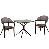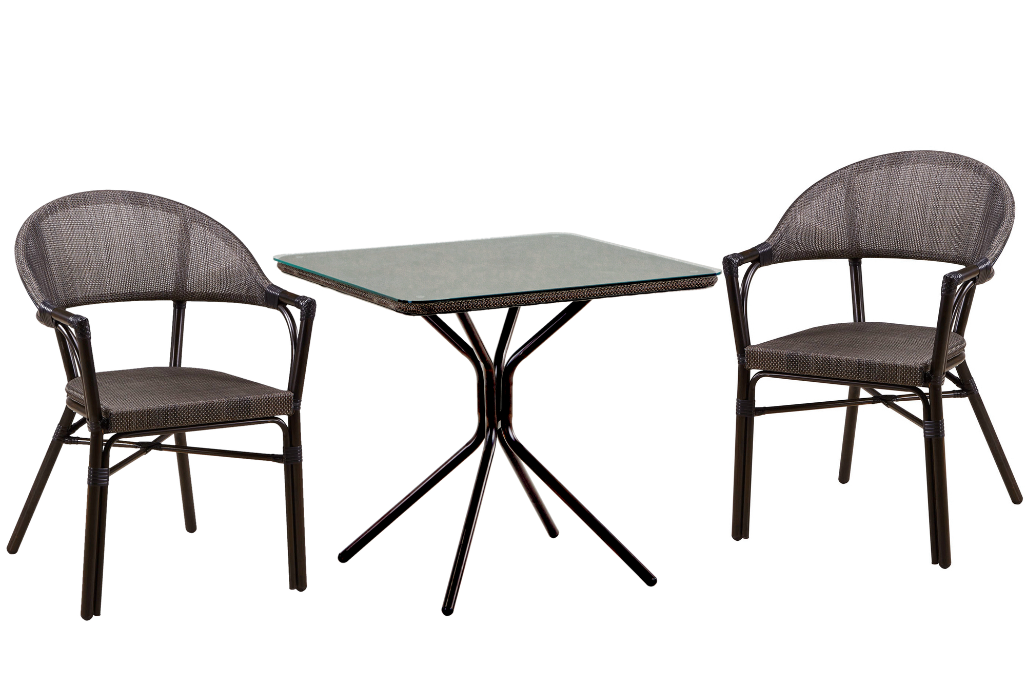 Обеденный комплект DS-05С от компании Vinotti включает в себя стол и два кресла. Все предметы гарнитура имеют прочную алюминиевую основу, обеспечивающую устойчивость и долговечность. Алюминий и текстилен - материалы, использованные в изготовлении комплекта, устойчивы к воздействию влаги и ультрафиолетовых лучей, сохраняют свой цвет и качество даже при длительном использовании под открытым небом. Столешница стола изготовлена из закаленного стекла, что придает ему прочность и привлекательный внешний вид, который завершается элегантным плетением из текстилена. Нестандартное расположение ножек, выполненных в виде крестовин, создает уникальный дизайн и обеспечивает удобное размещение кресел по всему периметру стола. Размеры стола: высота – 73см, ширина/длина – 80х80см. Стекло в комплекте, крепится при помощи присосок, входящих в комплект. Размеры кресла: высота – 84см, ширина – 57см, глубина – 59см. Максимальная нагрузка – до 110кг.