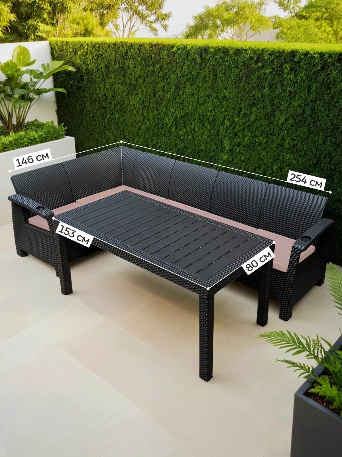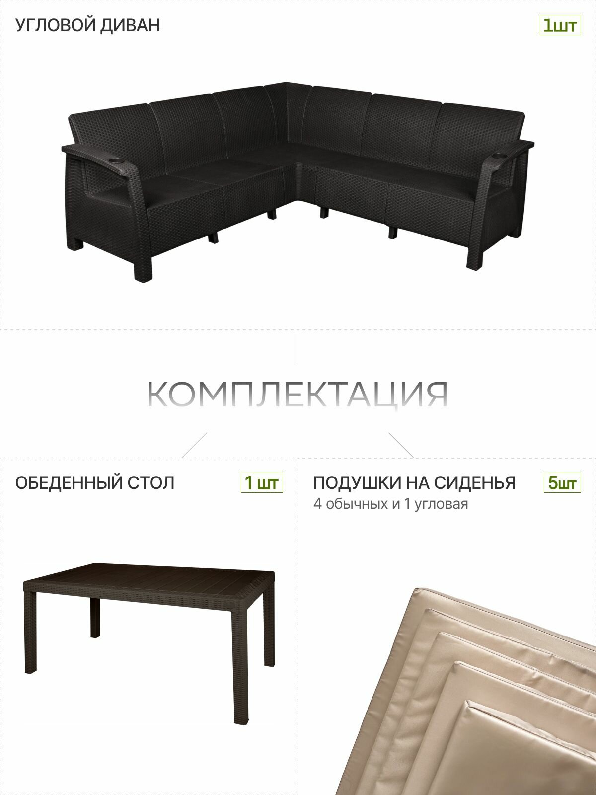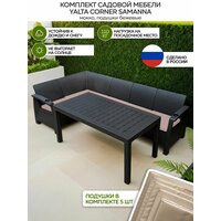 Комплект садовой мебели YALTA CORNER SAMANNA - это идеальное решение для тех, кто хочет создать уютную зону отдыха на открытом воздухе. Этот набор состоит из углового дивана и обеденного стола, которые выполнены в стиле искусственного ротангового плетения.