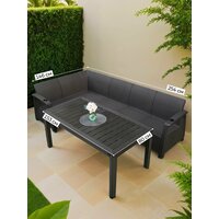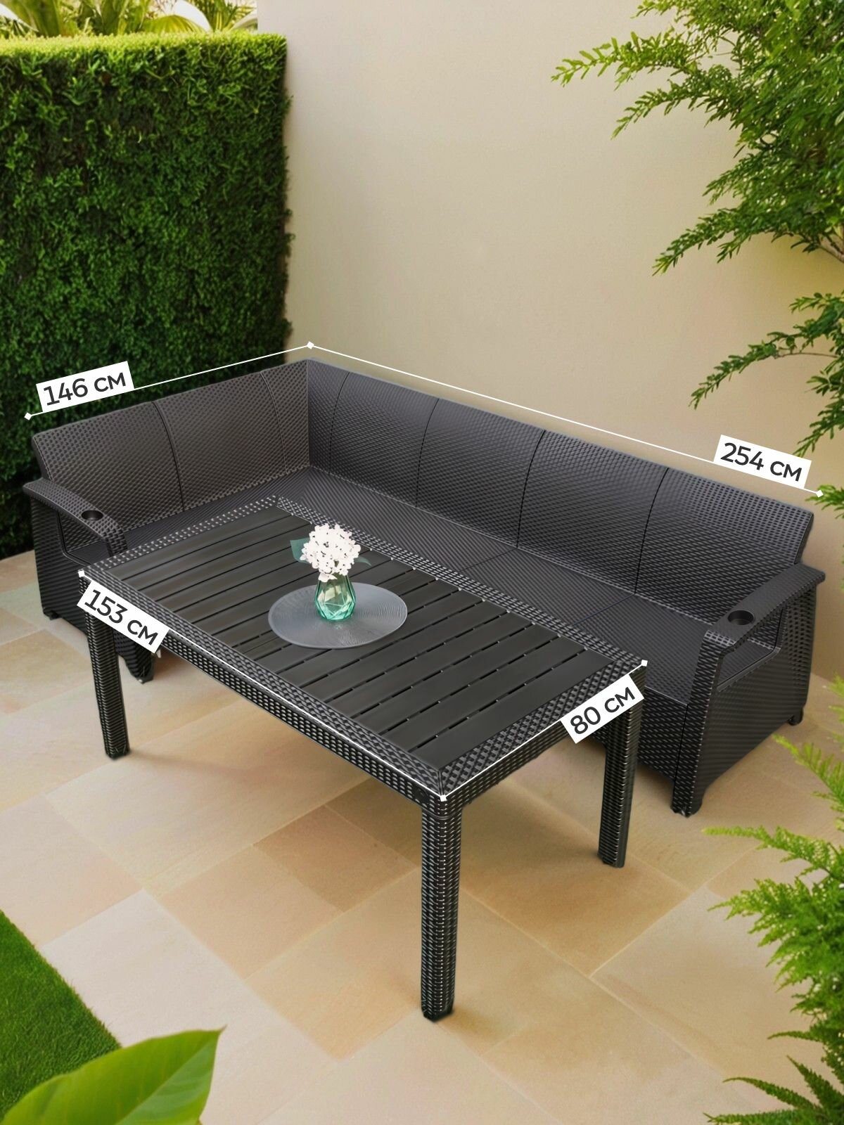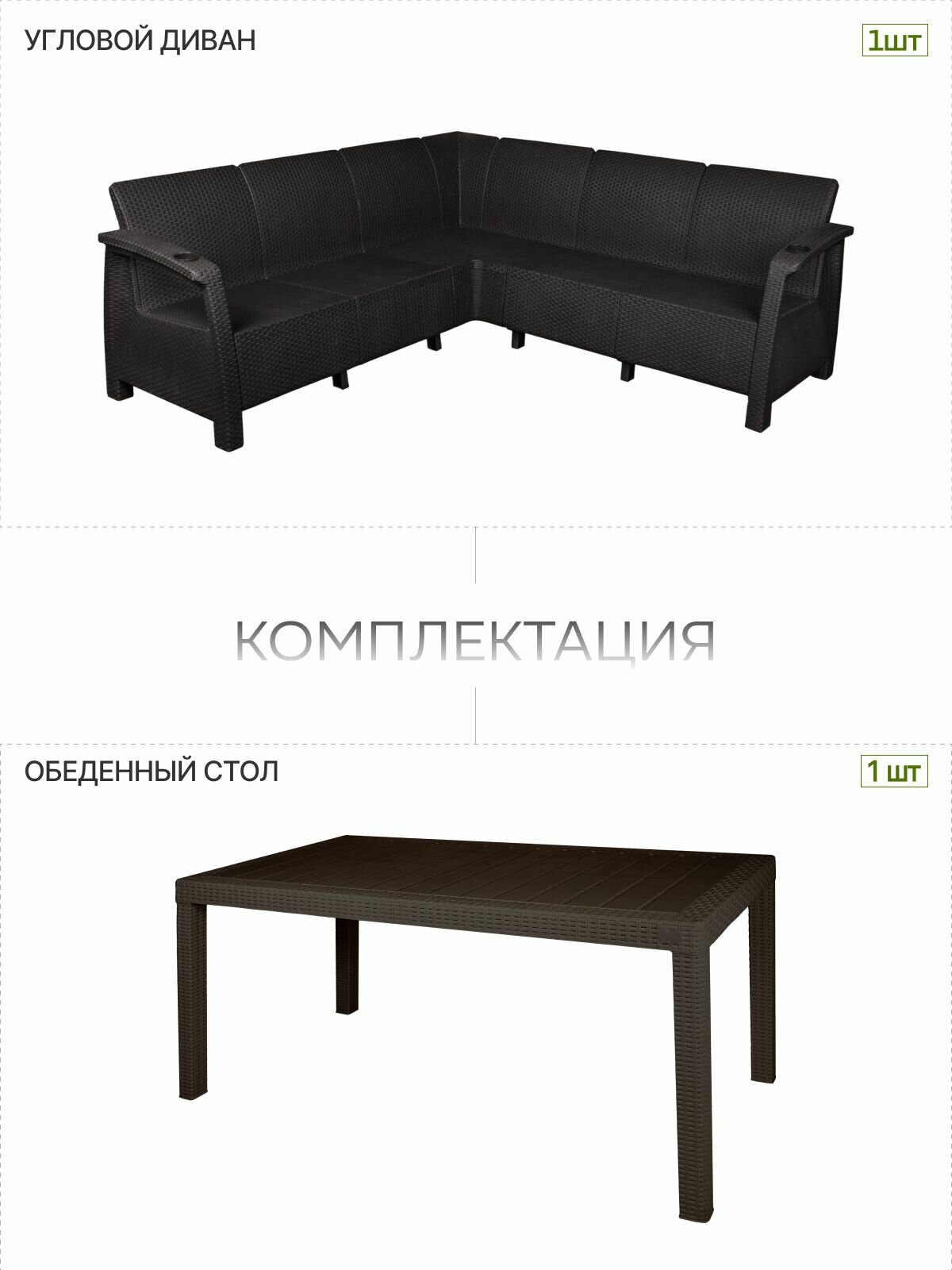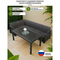 Комплект садовой мебели YALTA CORNER SAMANNA - это идеальное решение для тех, кто хочет создать уютную зону отдыха на открытом воздухе. Этот набор состоит из углового дивана и обеденного стола, которые выполнены в стиле искусственного ротангового плетения.