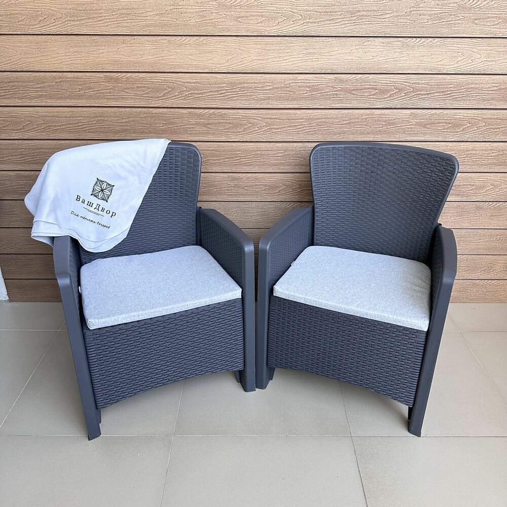 Комплект садовых кресел Bari под ротанг графит с подушками – это идеальное решение для вашего загородного участка, дачи или сада. Элегантное и современное кресло садовое выполнено из высококачественного пластика, имитирующего плетение ротанга. Это придает комплекту стильный и свежий вид, который гармонично впишется в любой экстерьер.