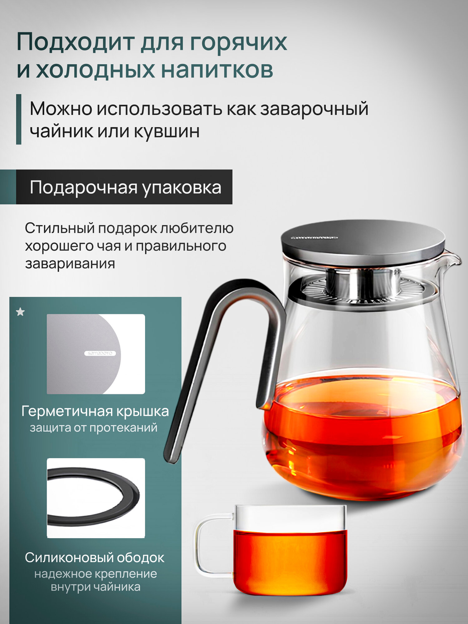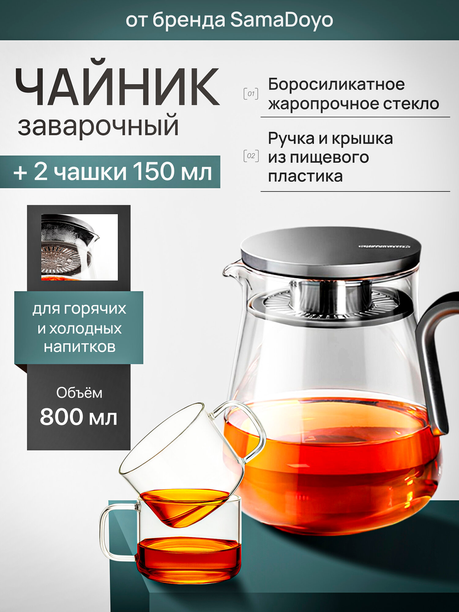 Комплект SamaDoyo Чайник заварочный из боросиликатного стекла 800 мл + 2 чашки для чая 150 мл: сравнение цен, характеристики, фото, актуальное наличие и цены.