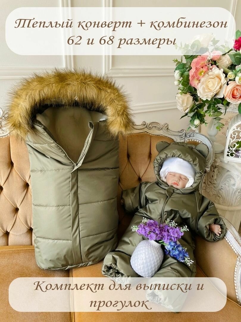 Размеры: конверт длина 70 см ширина 40 см, комбинезон 62 размер.