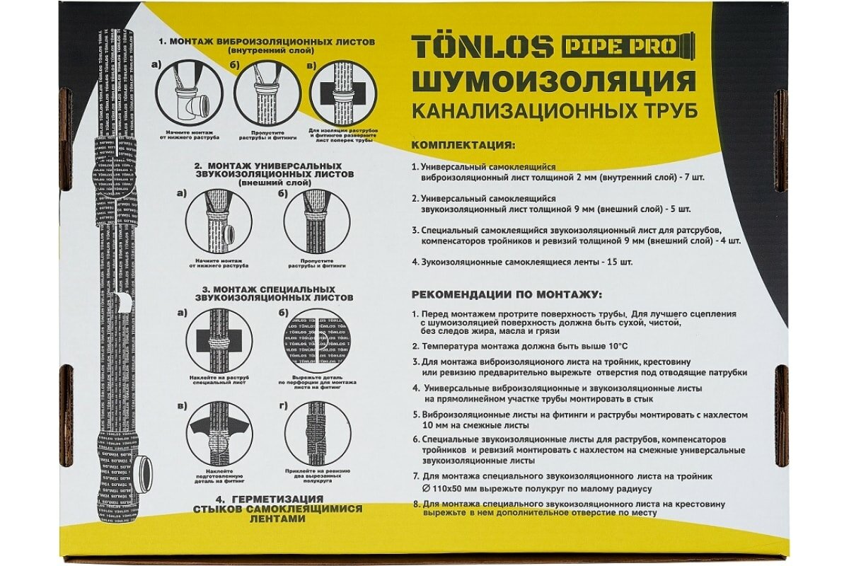| Подробная комплектация | 1. Виброизоляционный лист – 7 шт. 2. Универсальный звукоизоляционный лист – 5 шт. 3. Специальный звукоизоляционный лист – 4 шт. 4. Самоклеящаяся звукоизоляционная лента – 15 шт. |
