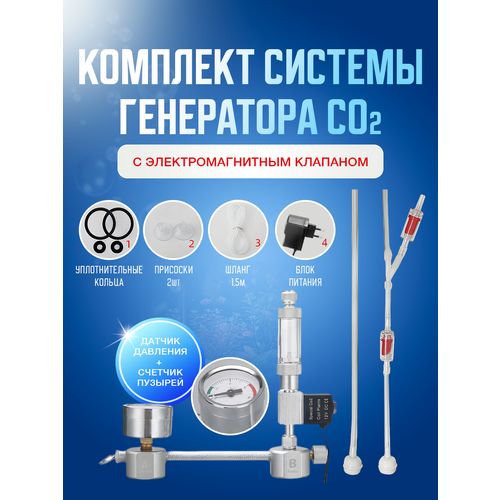 комплектация: Система генерации CO2 с монометром, игольчатым клапаном и клапаном аварийного сброса давления - 1 штука, счетчик пузырьков - 1 штука, распылитель пузырьков CO2 в аквариуме - 1 штука, обратный клапан - 6 штук, шланг - 1.5 метра, разветвитель - 1 штука, распылитель-утяжелитель - 2 штуки, резиновые уплотнительные кольца большие - 2 штуки, резиновые уплотнительные кольца мини - 2 штуки, присоски - 2 штуки