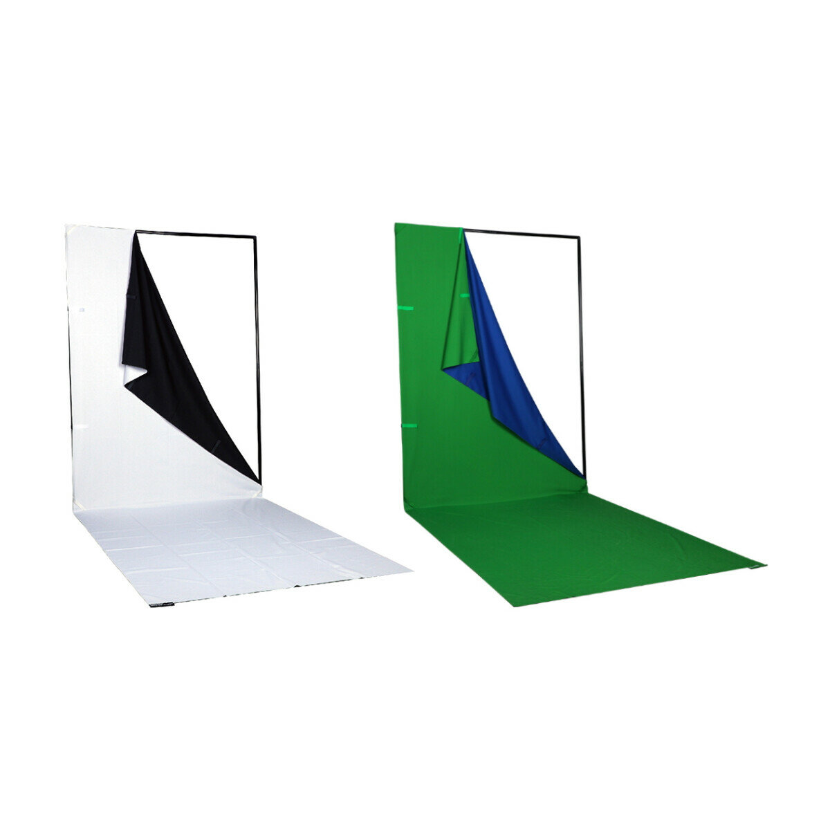 Мобильная система установки фонов размером 152 х 226 см включает в себя разборную раму и два двухсторонних фона: первый со сторонами синего и зеленого цветов, а второй со сторонам черного и белого цветов. В комплект также входит сумка-чехол для хранения и переноски.