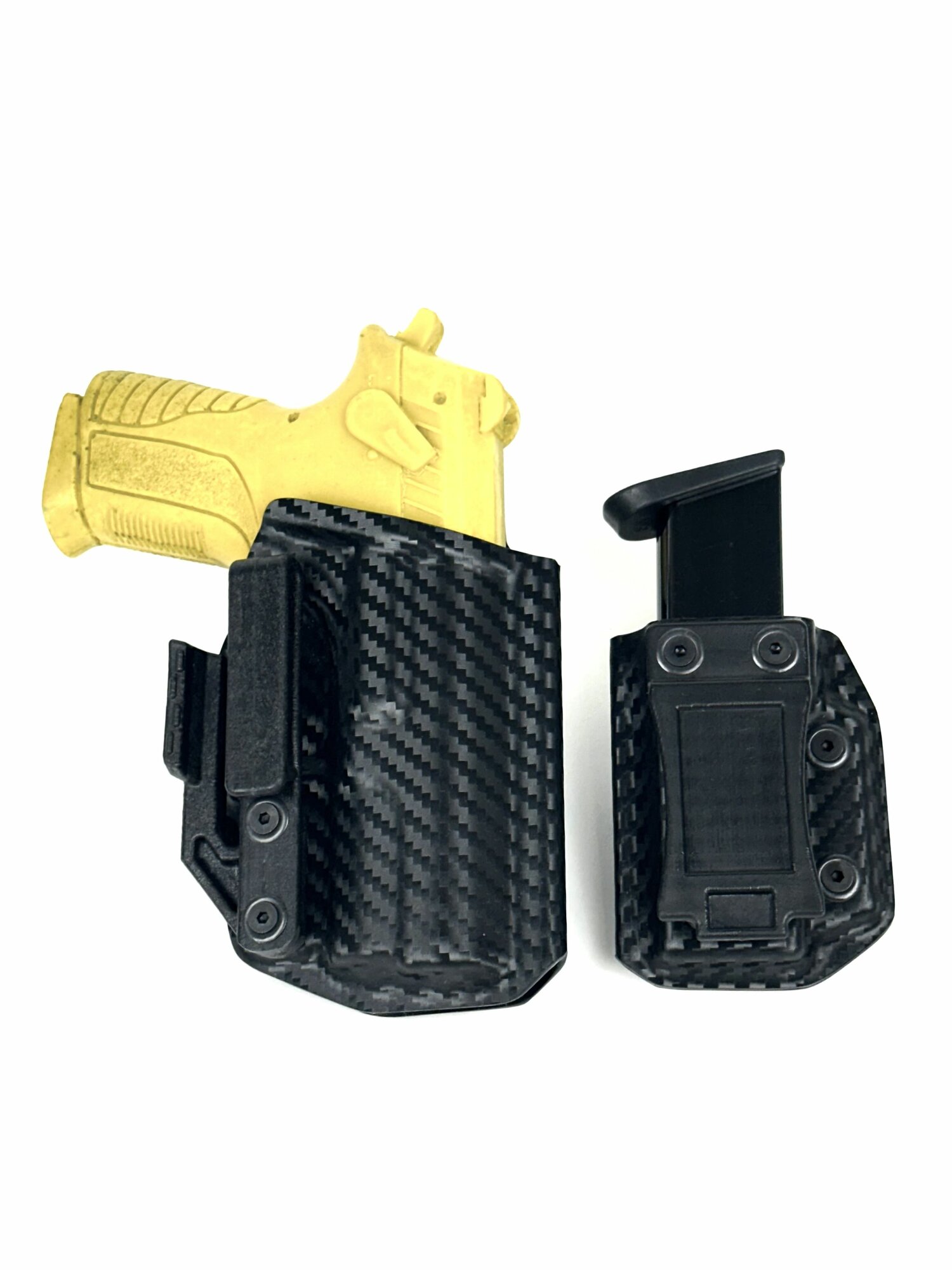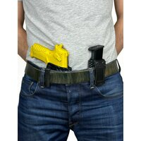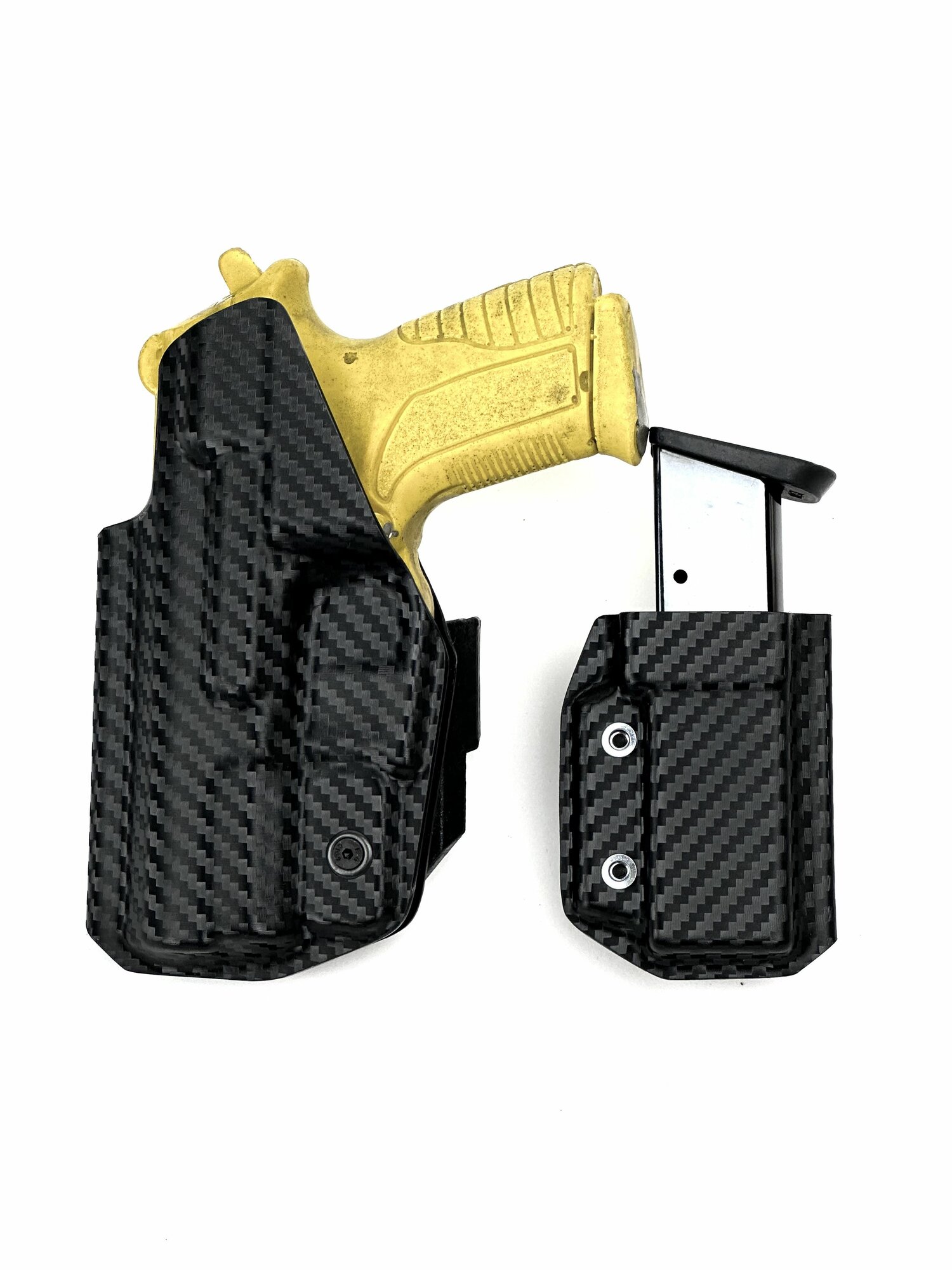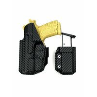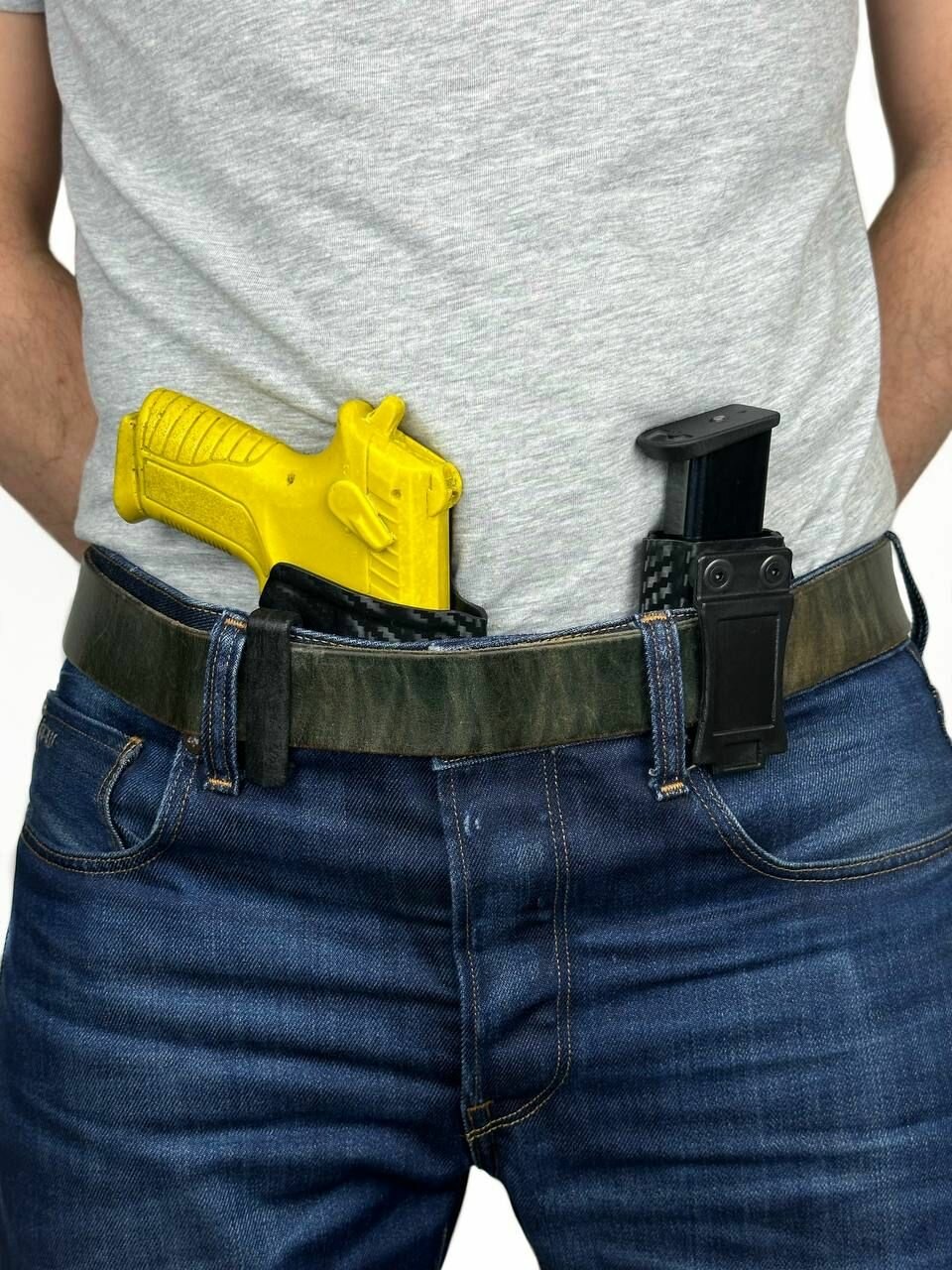В комплекте идет подсумок (паучер) скрытого ношения из кайдекса с текстурой под карбон (KYDEX®), под один дополнительный магазин. Подсумок является универсальным с точки зрения размещения на поясе. Можно размещать внутри брючно (между телом и брюками), а также как внешний поясной.