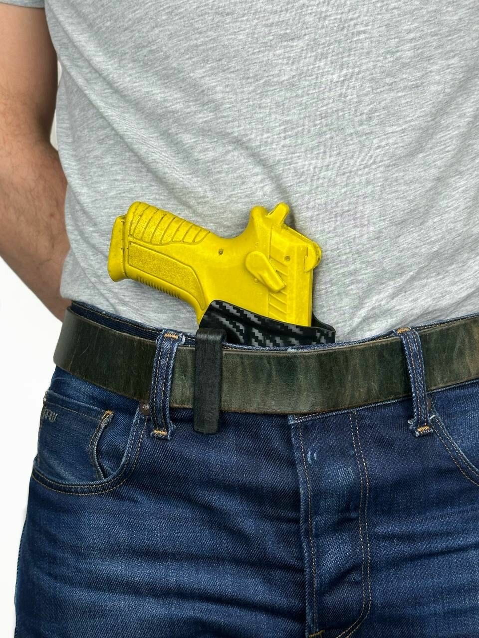 Кобура скрытого ношения с узкой клипсой и поясным упором из кайдекса с текстурой под карбон(KYDEX®), для пистолета Grand Power T11 и Grand Power TQ1