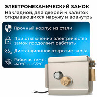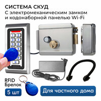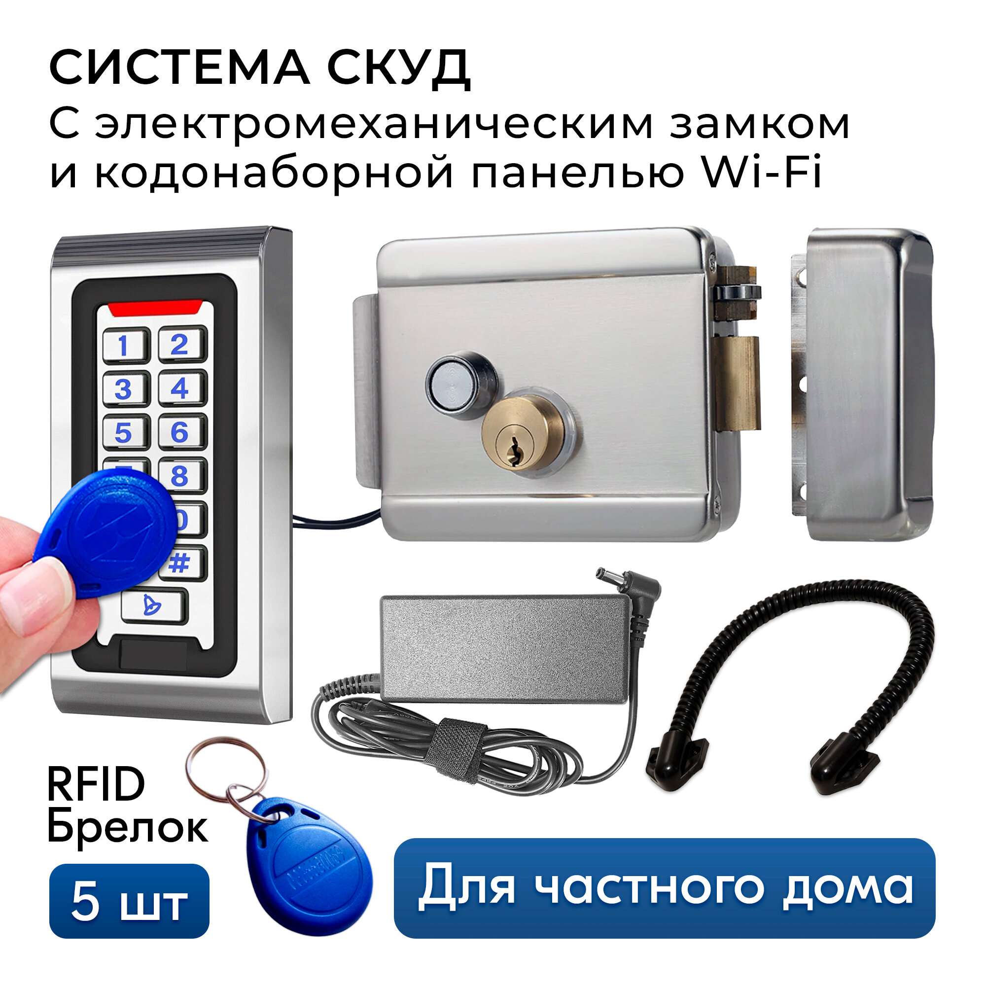 Электромеханический замок - 1 шт. Кодонаборная панель со встроенным считывателем - 1 шт. Блок питания 12 В - 1 шт. Гибкий переход - 1 шт. RFID ключи - 5 шт.