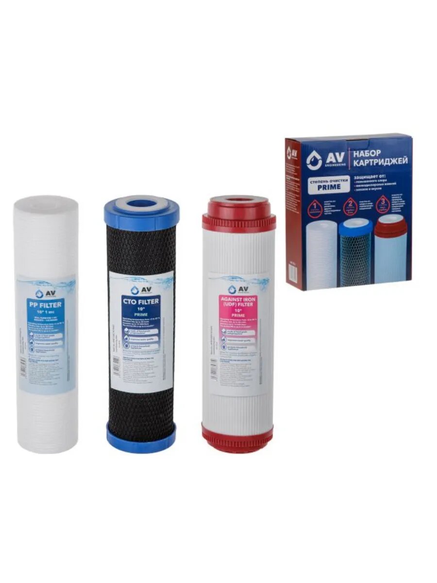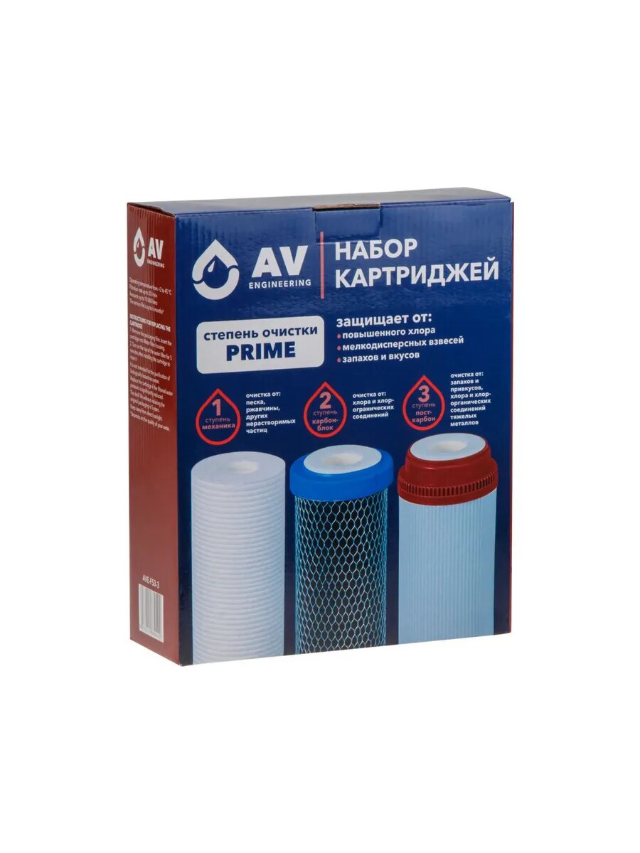 Комплект сменных картриджей AV Engineering "Prime" для систем очистки воды, slim line 10" предназначен для предварительной трёхступенчатой очистки хозяйственной и технической воды от различных загрязнений.
